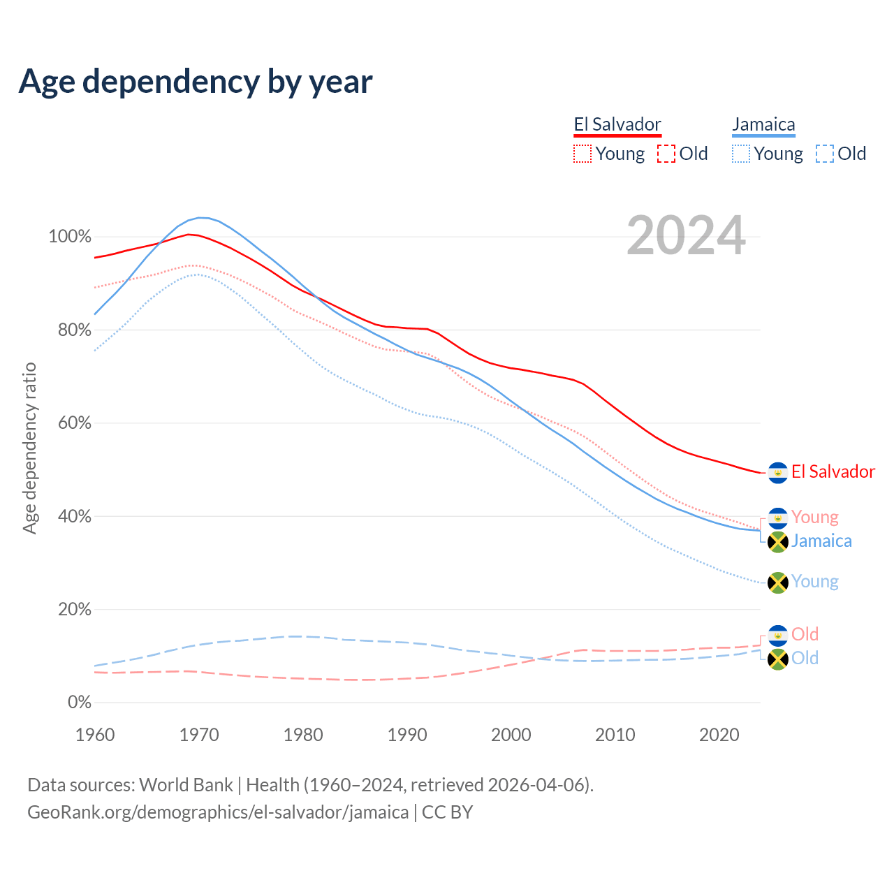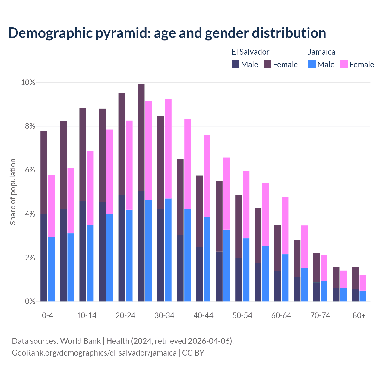 - The share of old-age demographic (65+) in El Salvador is 8.15% vs 8.21% in Jamaica.