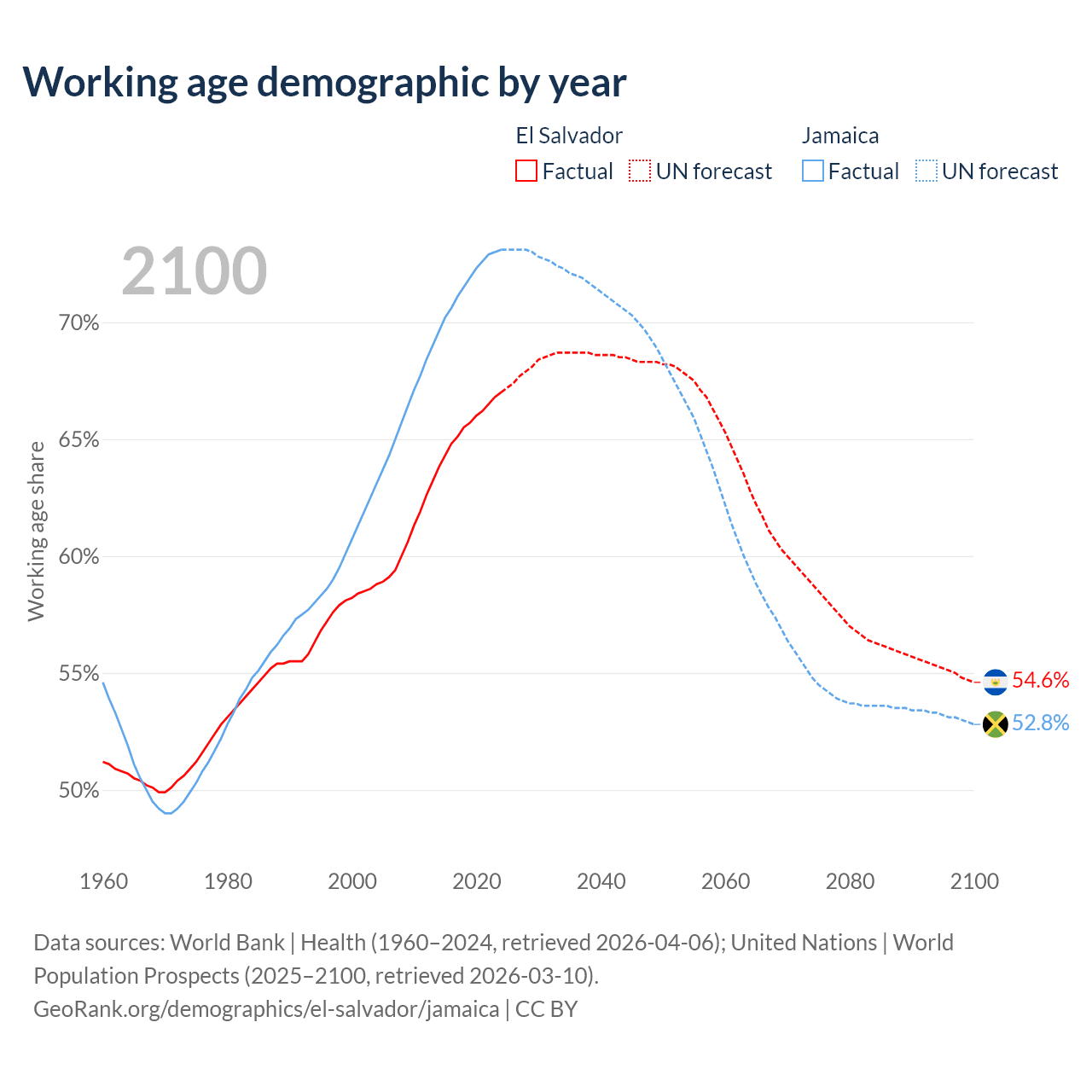 Median age El Salvador vs Jamaica, 1960-2100