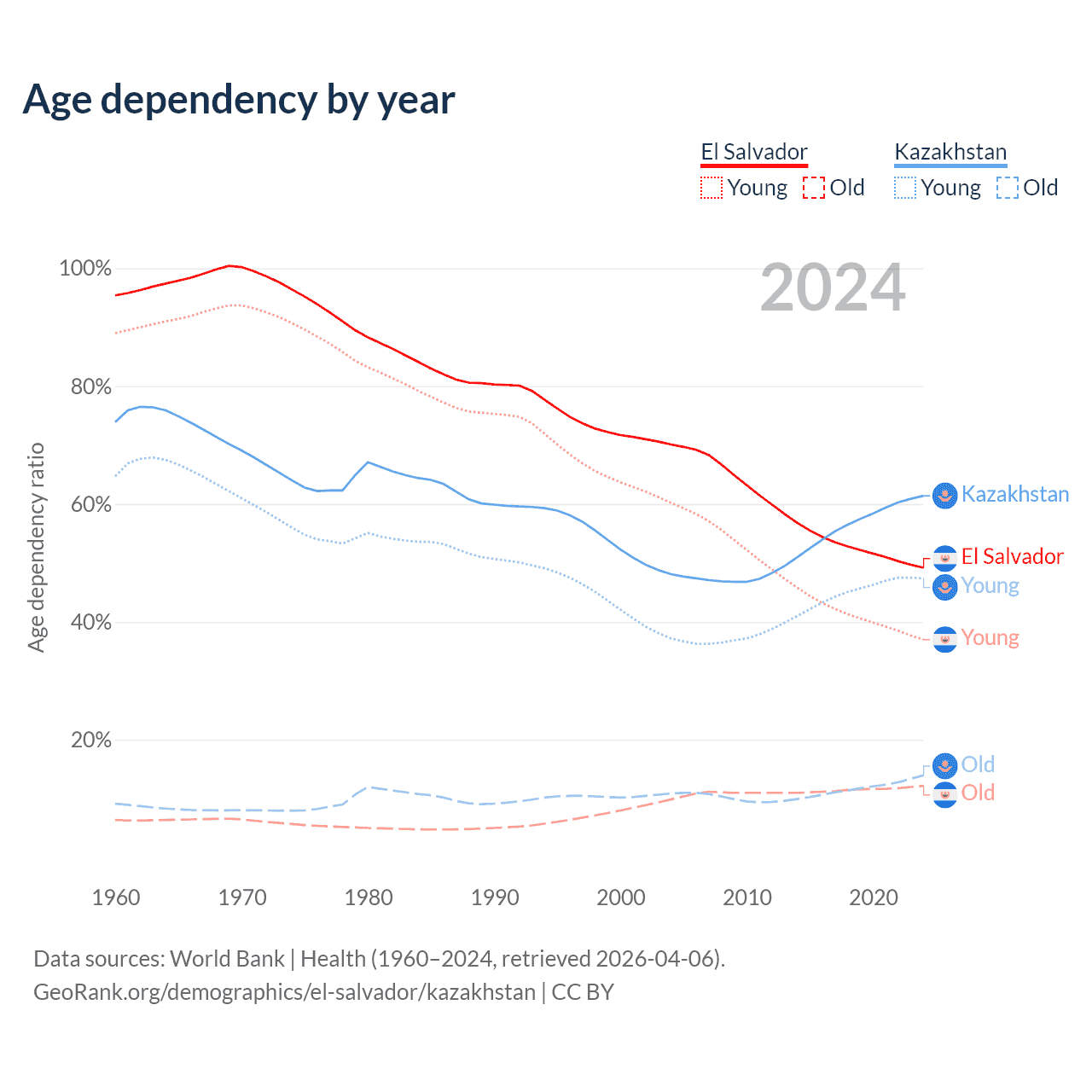 Data sources: World Bank | Health (1960–2024, retrieved 2026-04-06); U.S. Census Bureau (1960–2024, retrieved 2026-02-08).