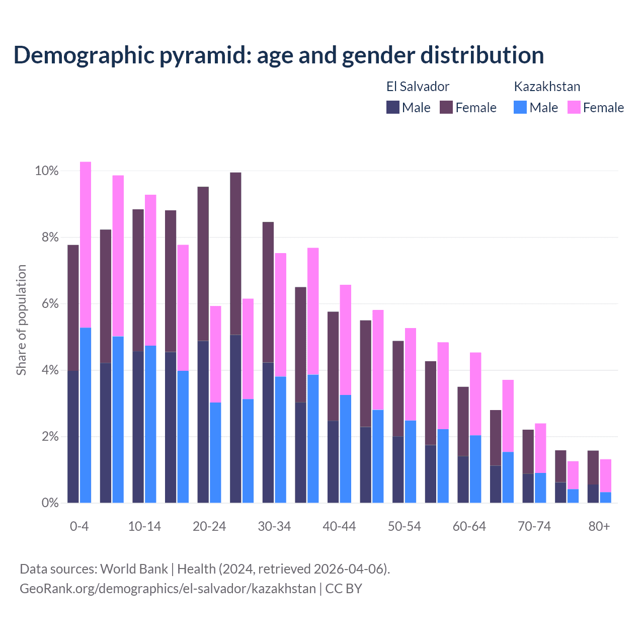 - The share of young demographic (0-15 years old) in El Salvador is 24.8% vs 29.4% in Kazakhstan.