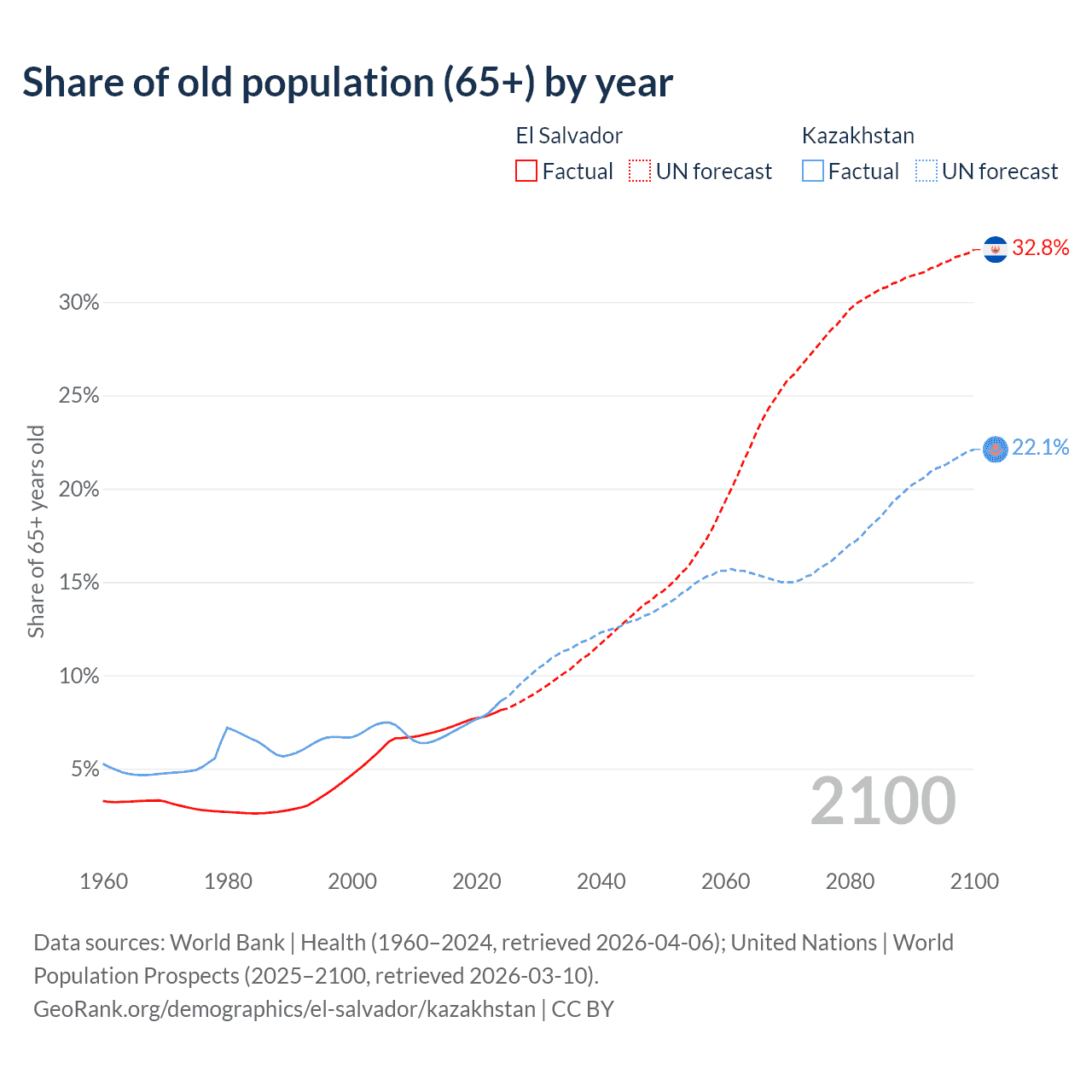 The share of older people aged 65 and over is 8.15% in El Salvador and 8.65% in Kazakhstan. Life expectancy in El Salvador compared to Kazakhstan .