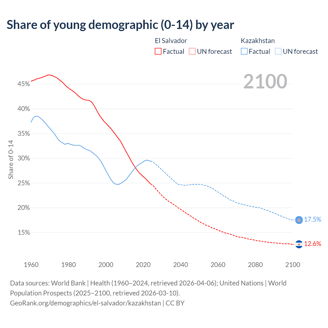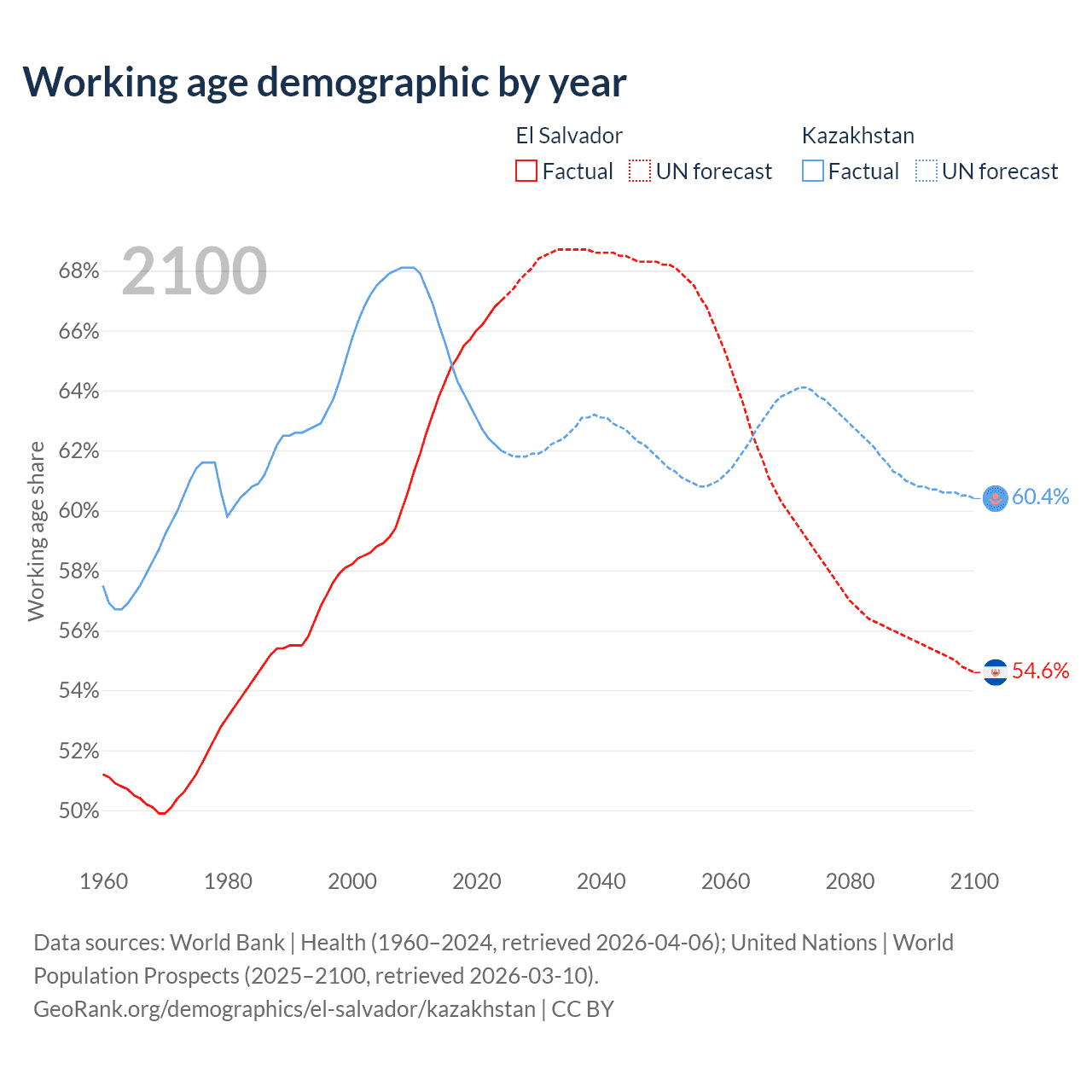 Median age El Salvador vs Kazakhstan, 1960-2100