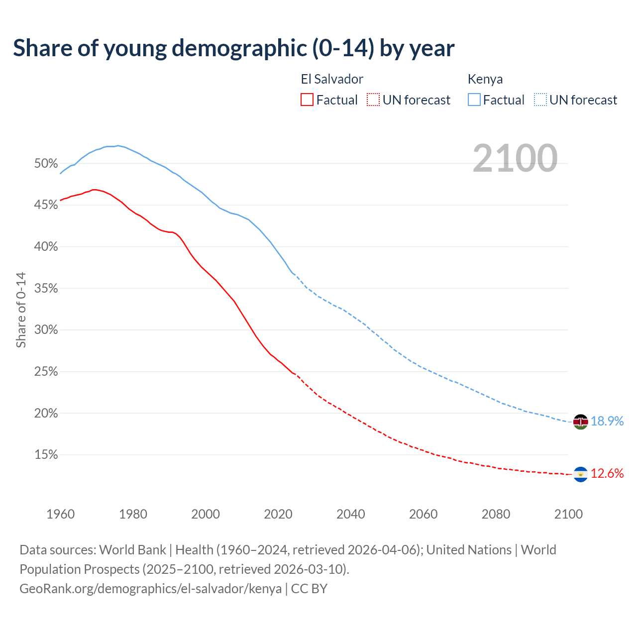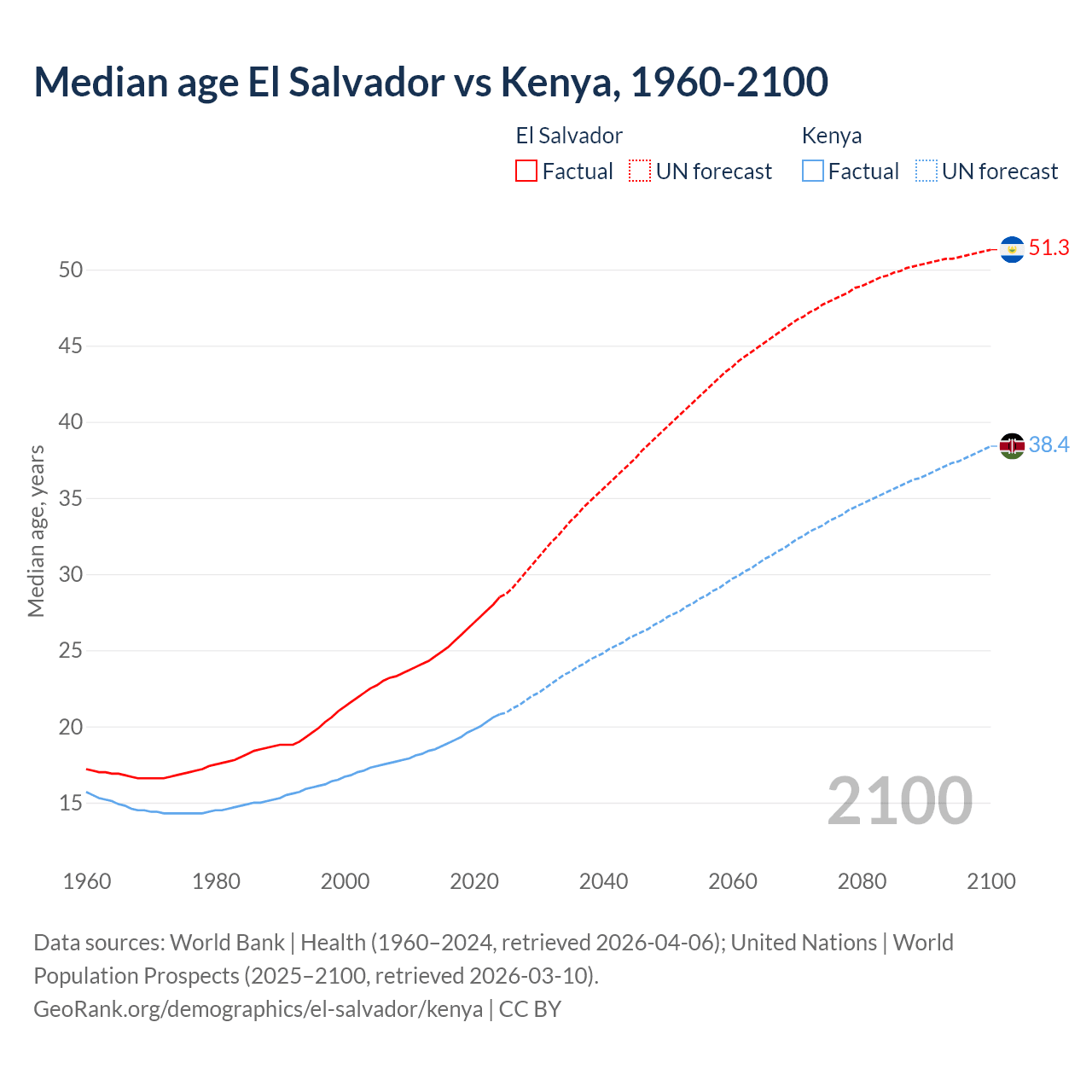 Median age El Salvador vs Kenya, 1960-2100