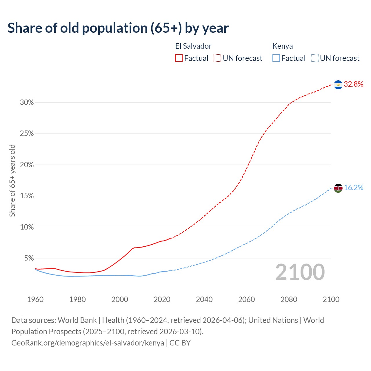 - The share of old-age demographic (65+) in El Salvador is 8.15% vs 2.97% in Kenya.