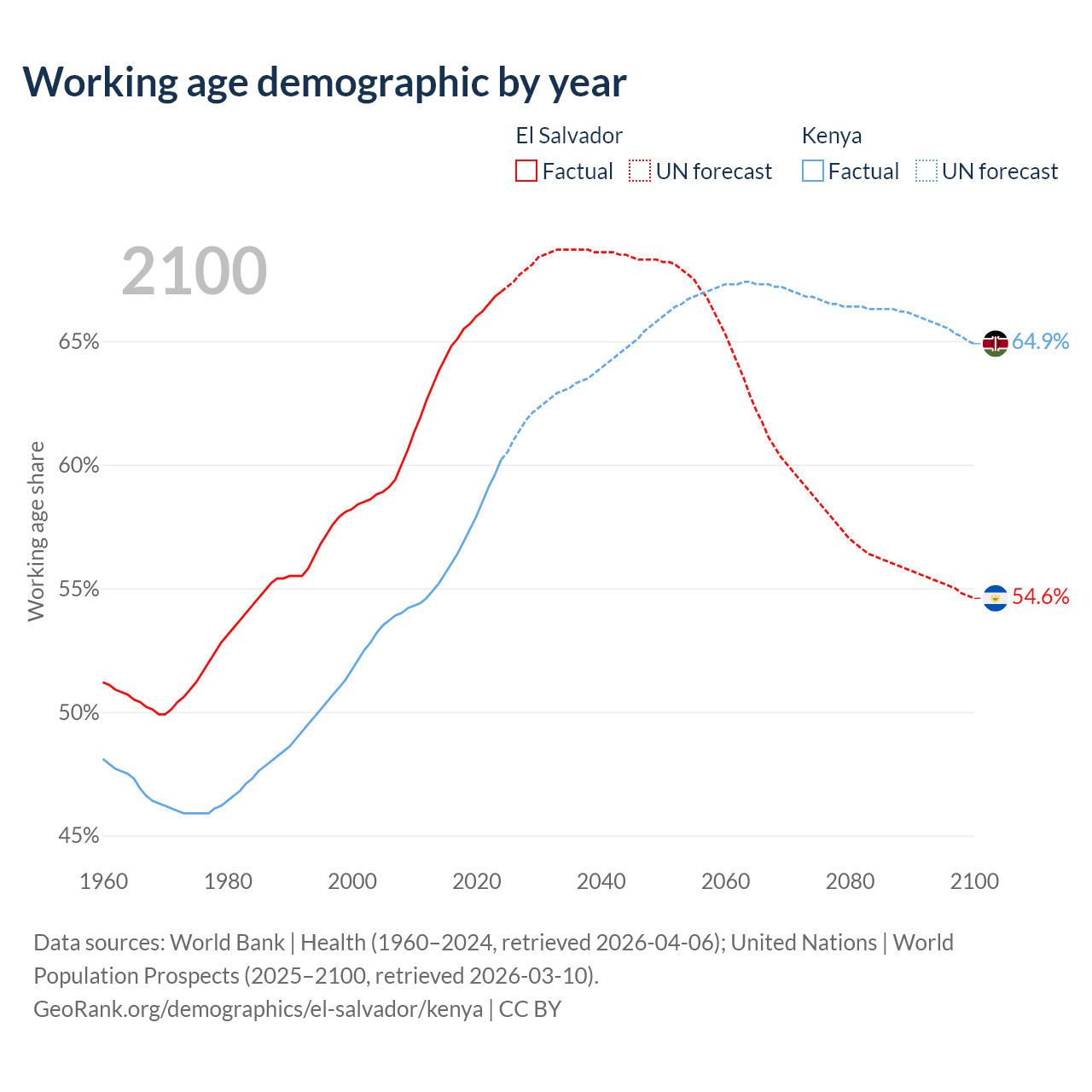 The share of older people aged 65 and over is 8.15% in El Salvador and 2.97% in Kenya. Life expectancy in El Salvador compared to Kenya .