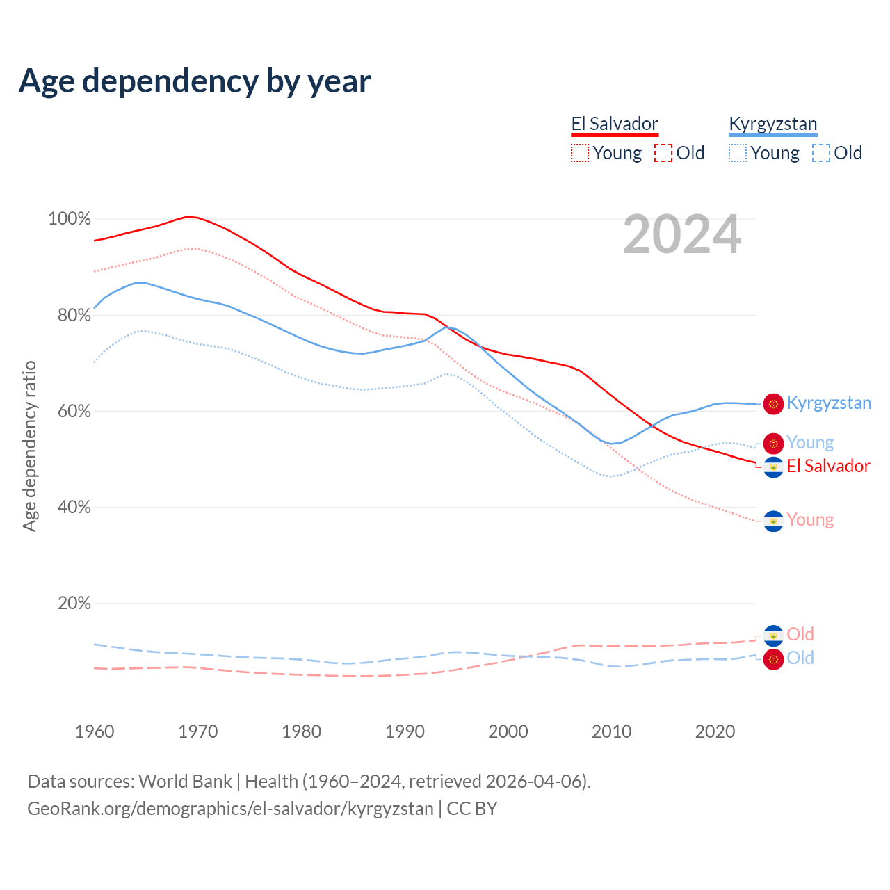 - The share of young demographic (0-15 years old) in El Salvador is 24.8% vs 32.3% in Kyrgyzstan.