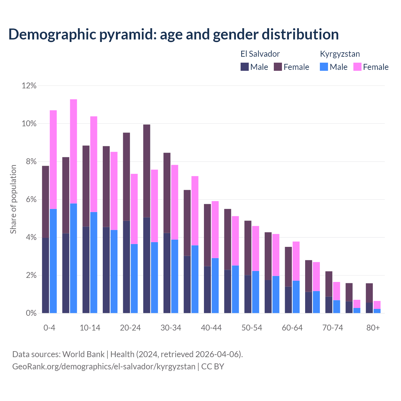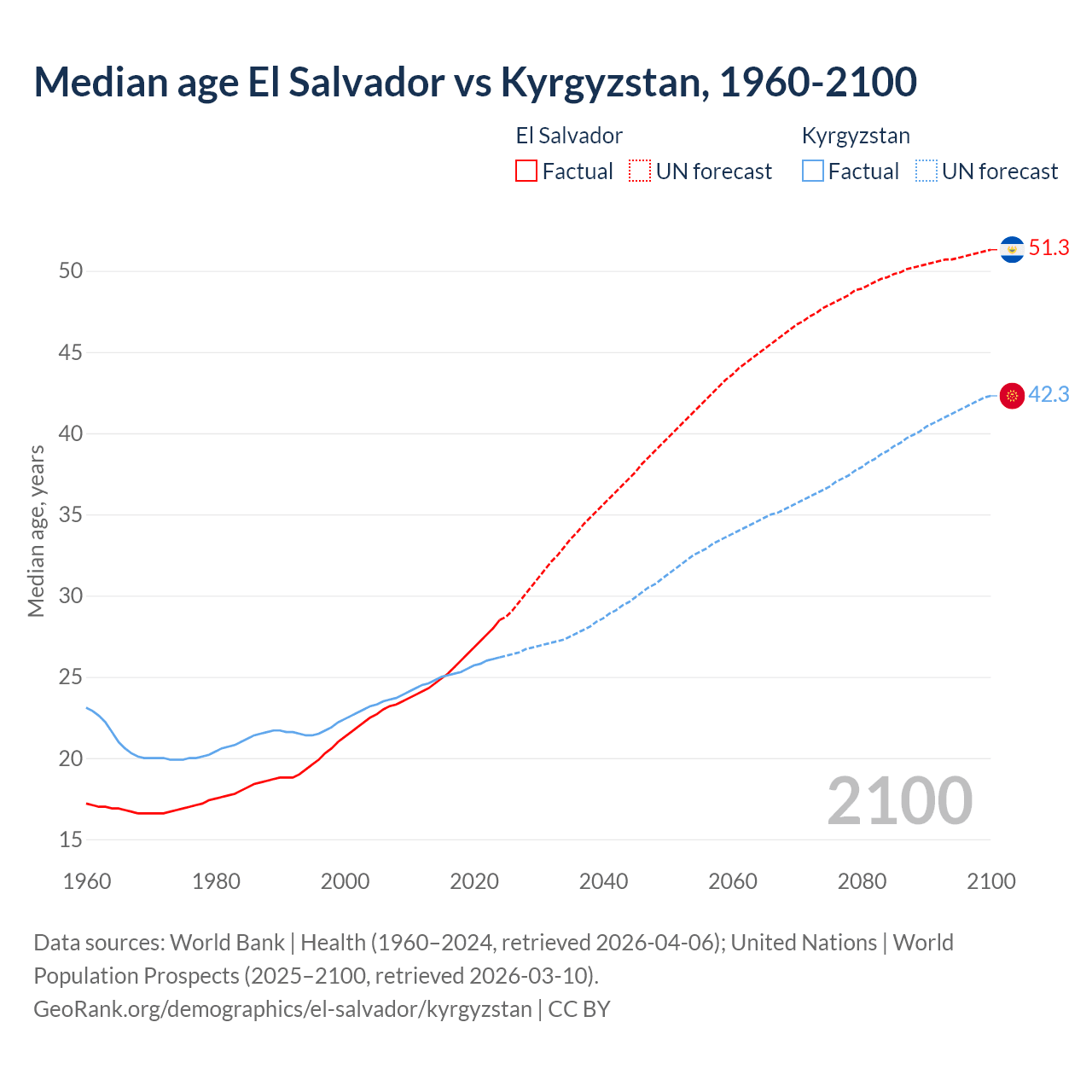 - El Salvador is ranked 115/196 by median age (oldest to youngest) vs 126/196 for Kyrgyzstan.