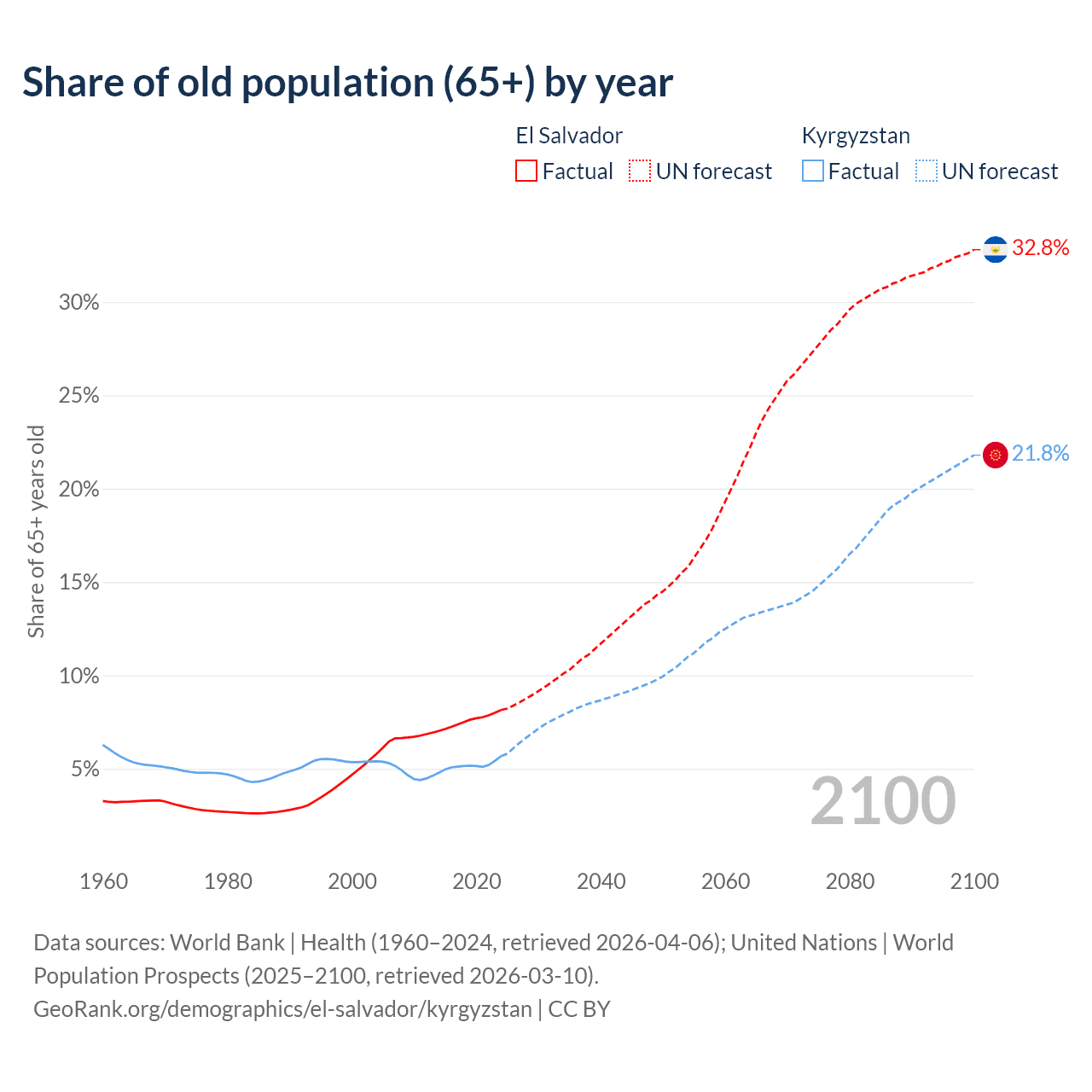 - The share of old-age demographic (65+) in El Salvador is 8.15% vs 5.68% in Kyrgyzstan.
