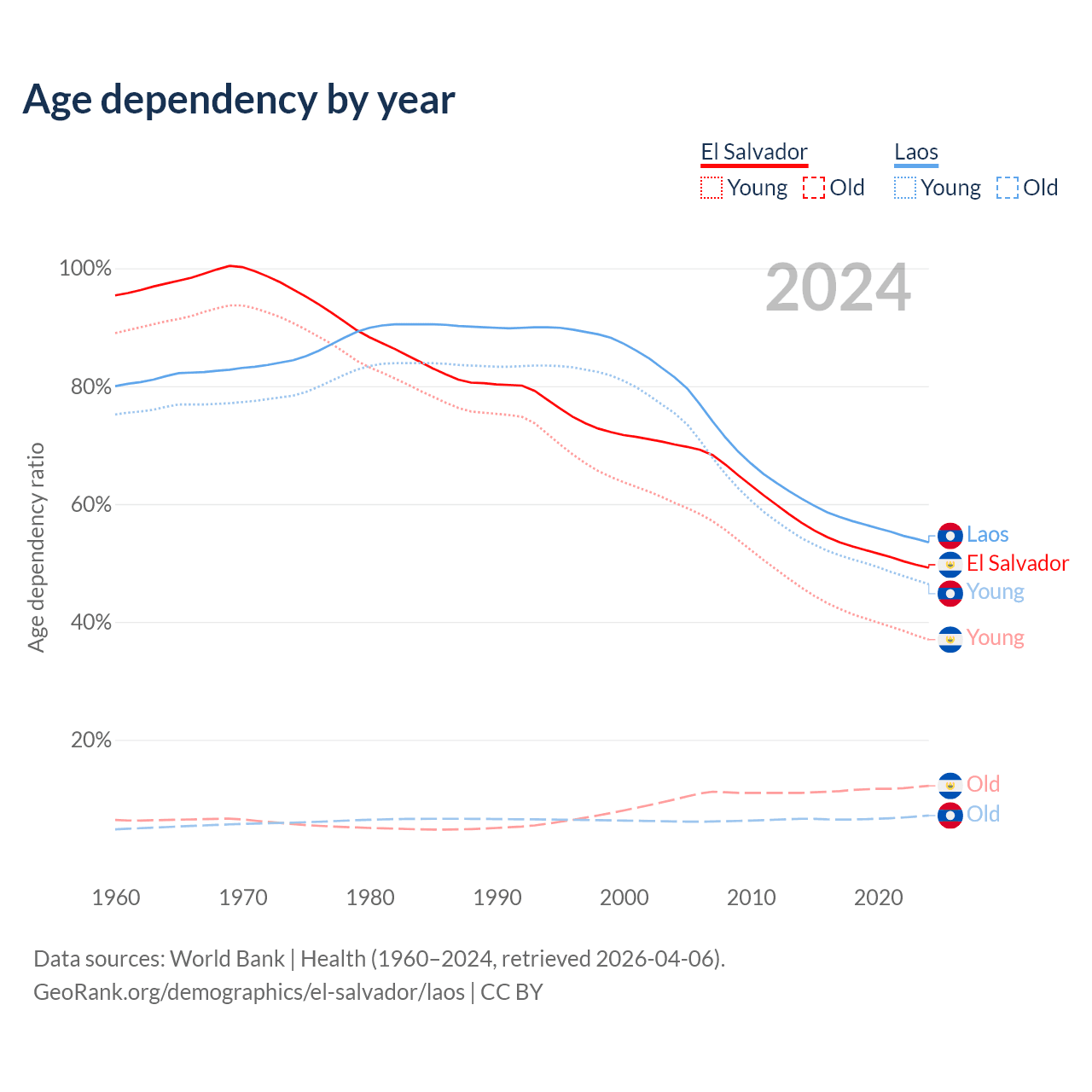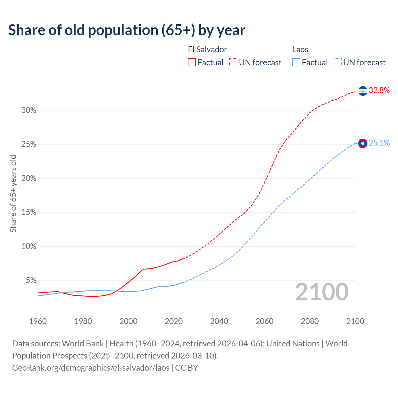 - The share of old-age demographic (65+) in El Salvador is 8.15% vs 4.67% in Laos.
