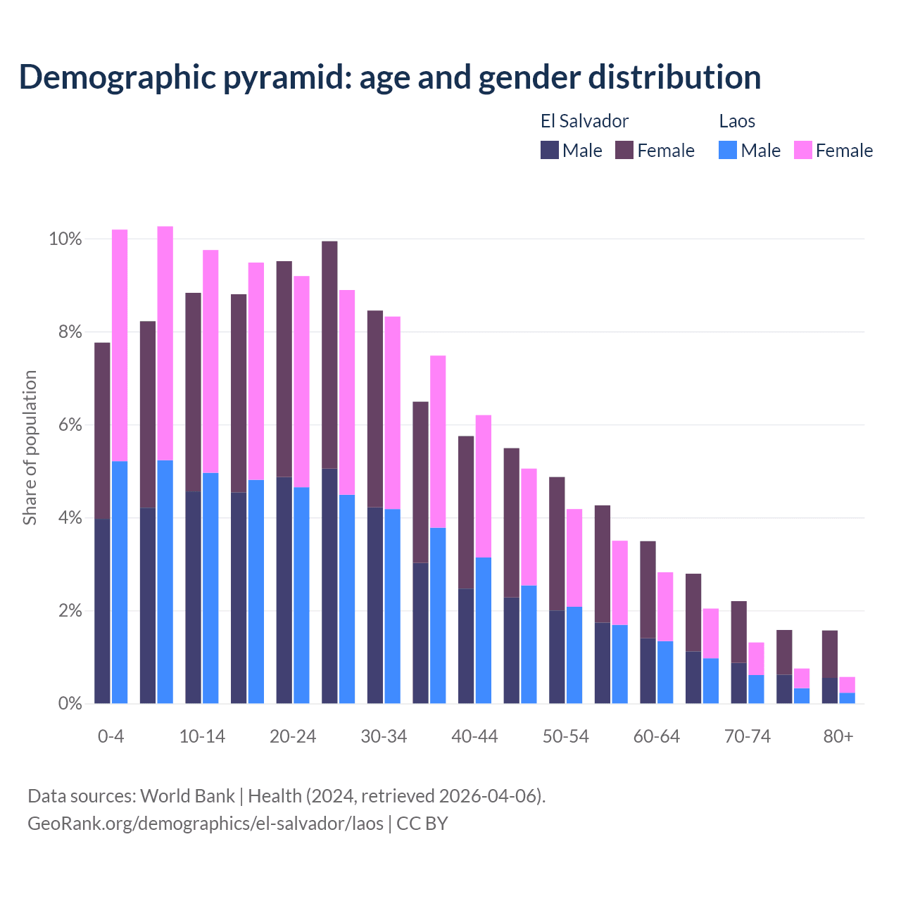 - El Salvador is ranked 115/196 by median age (oldest to youngest) vs 130/196 for Laos.