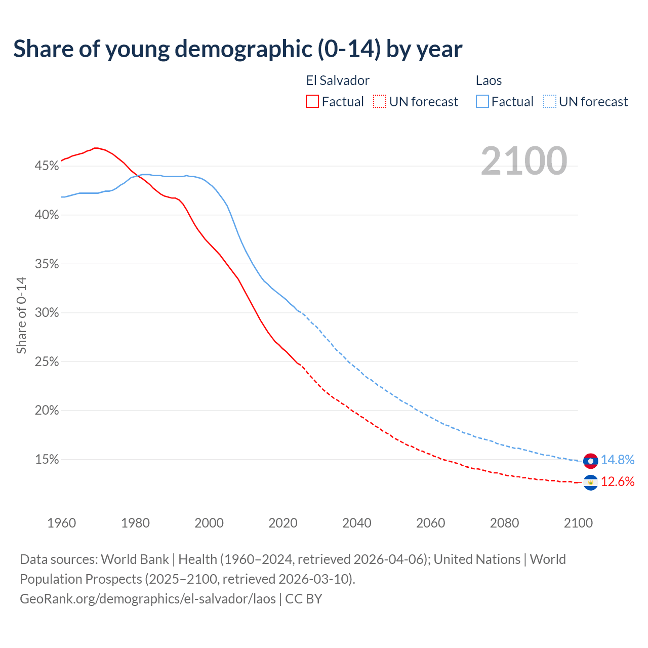 - The share of young demographic (0-15 years old) in El Salvador is 24.8% vs 30.2% in Laos.