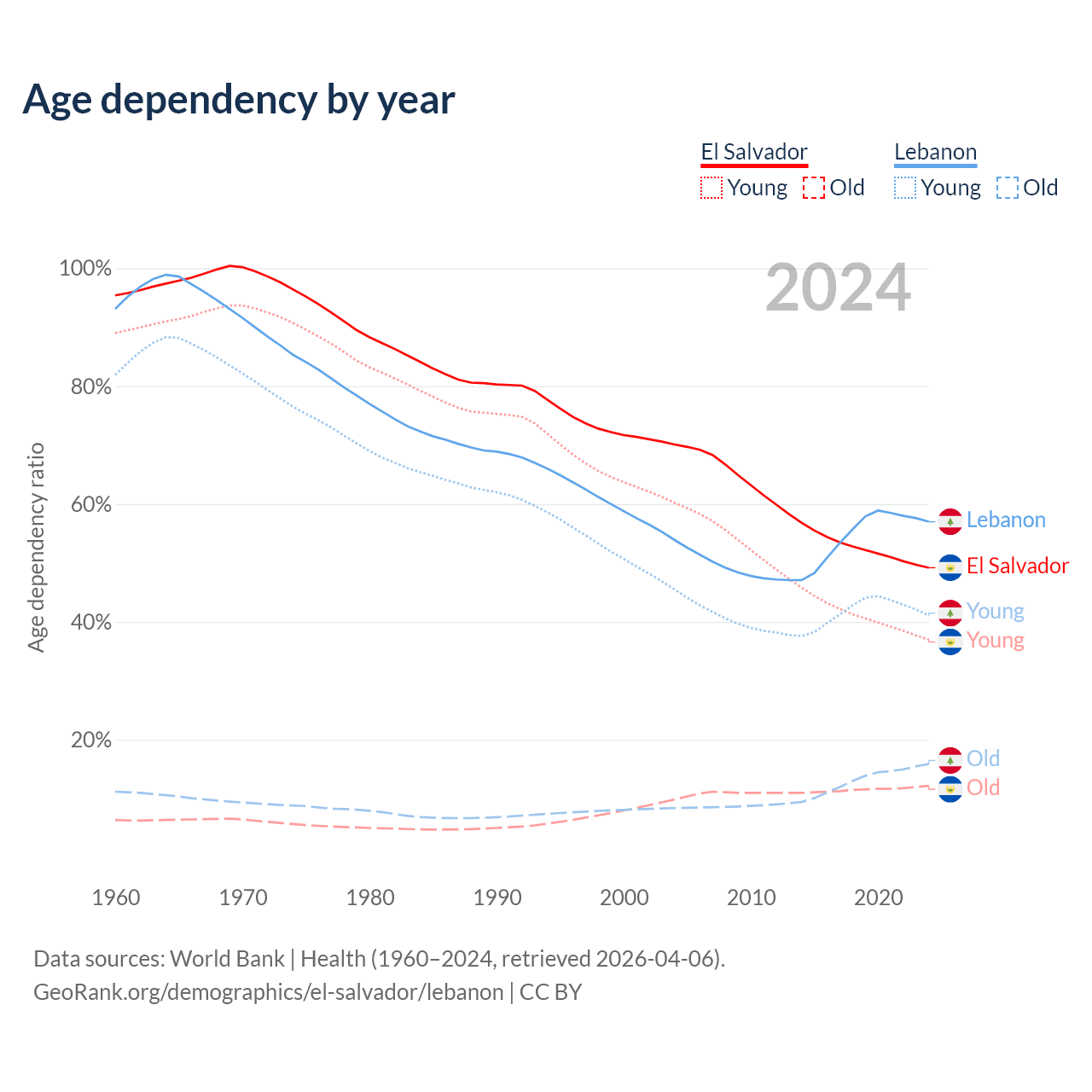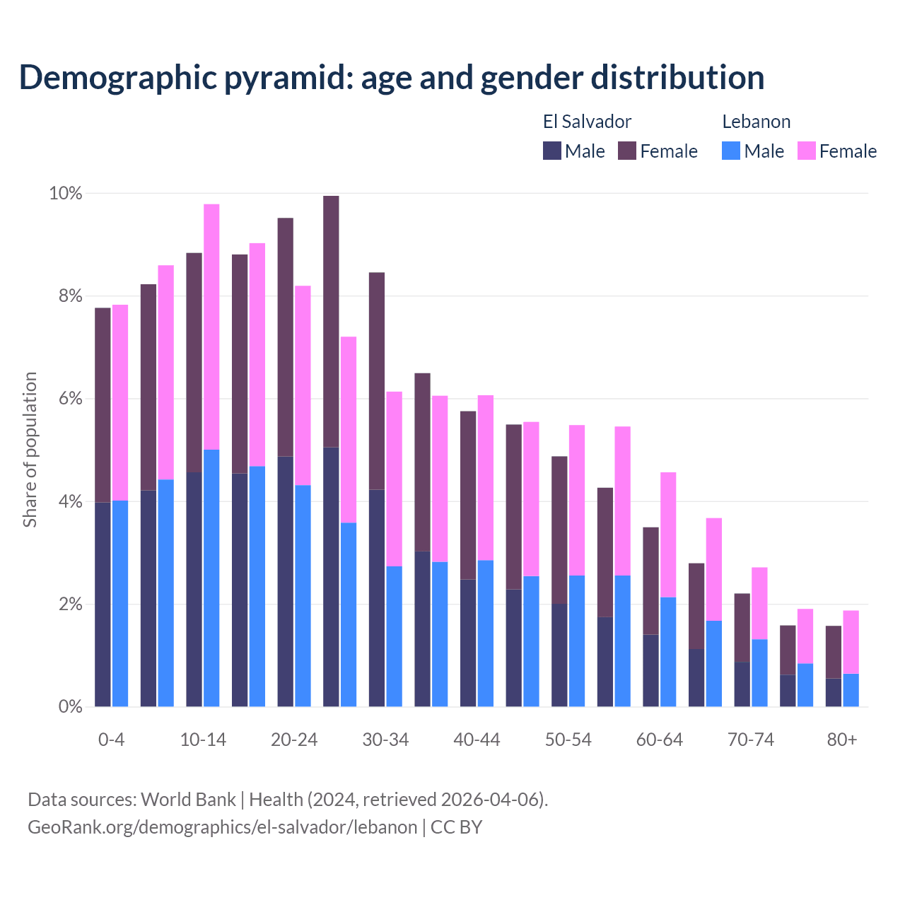 - El Salvador is ranked 115/196 by median age (oldest to youngest) vs 106/196 for Lebanon.