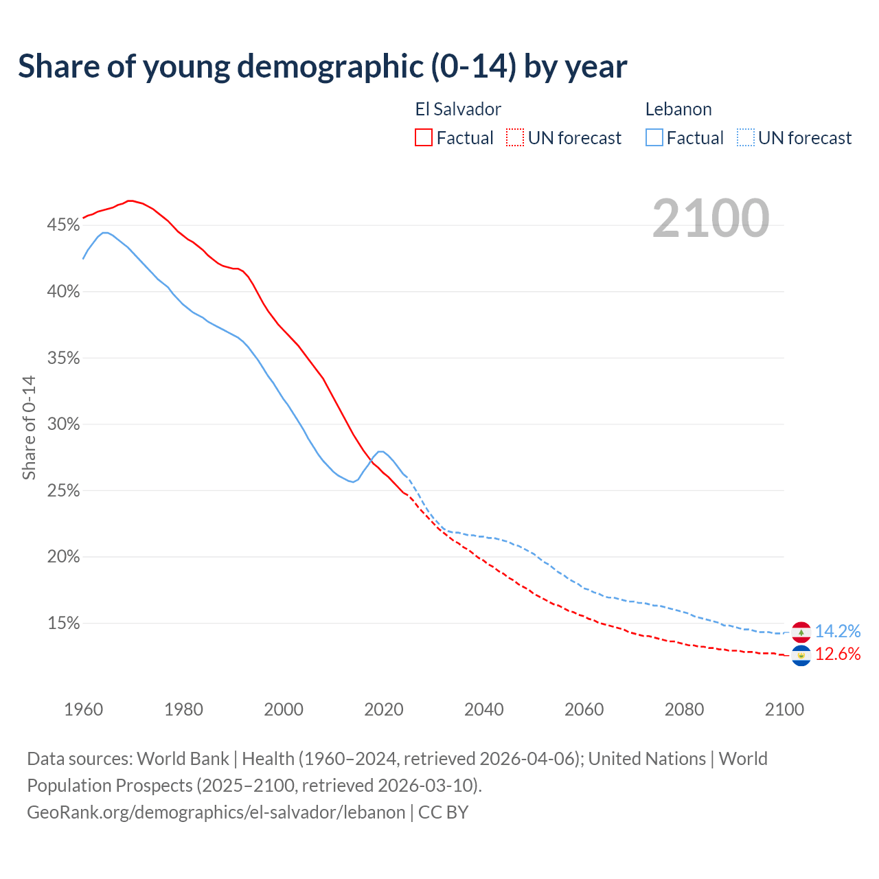 - The share of young demographic (0-15 years old) in El Salvador is 24.8% vs 26.2% in Lebanon.