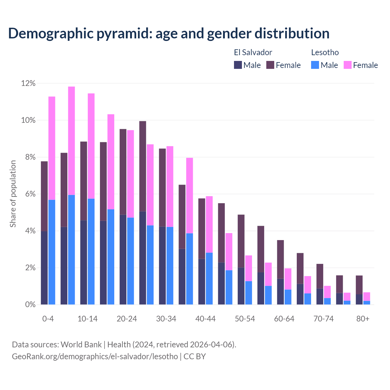 - The share of old-age demographic (65+) in El Salvador is 8.15% vs 3.86% in Lesotho.