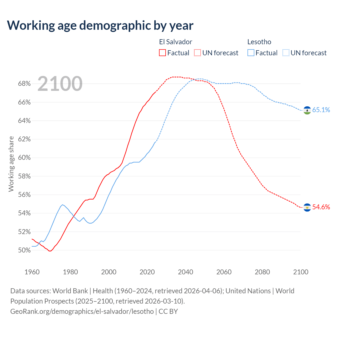 Median age El Salvador vs Lesotho, 1960-2100