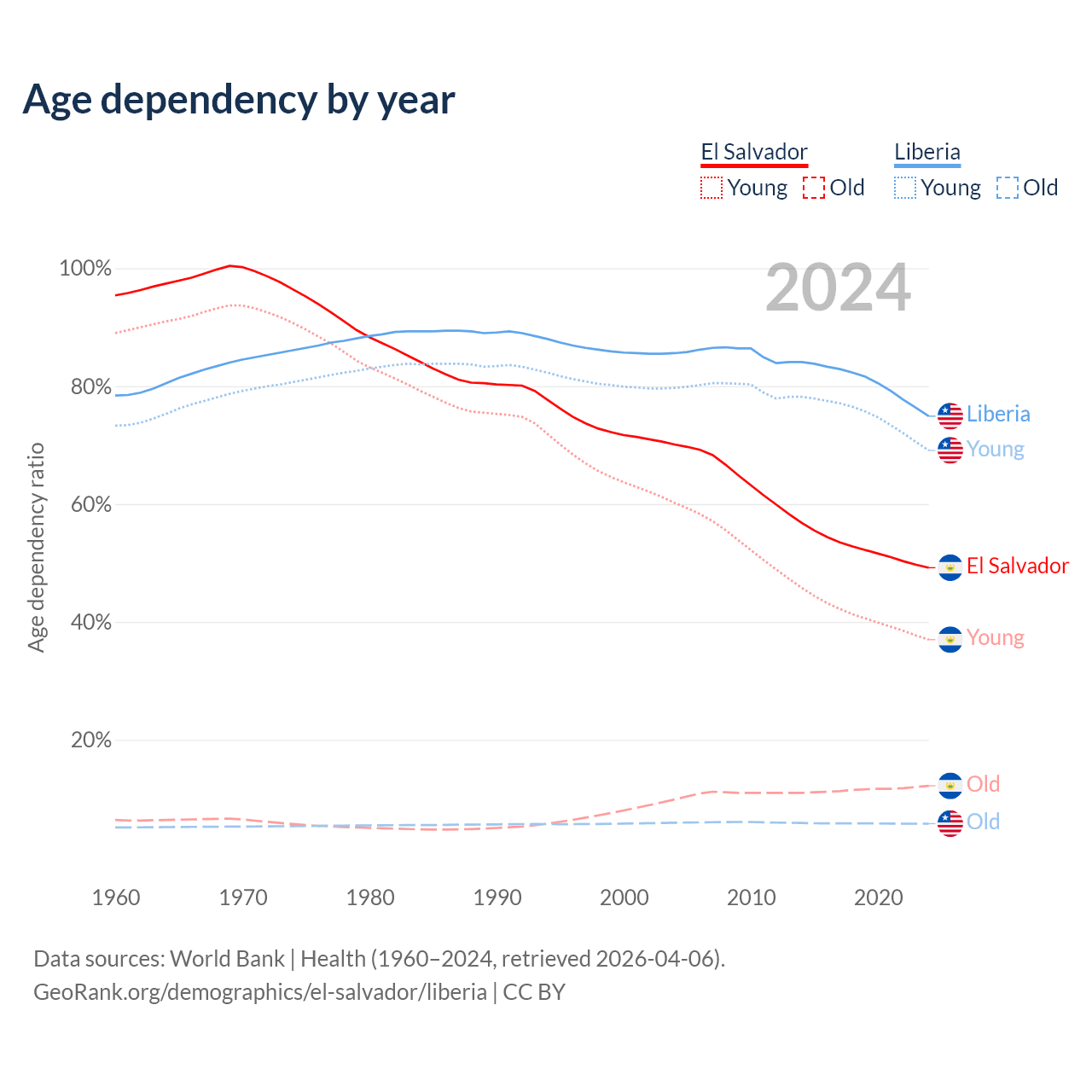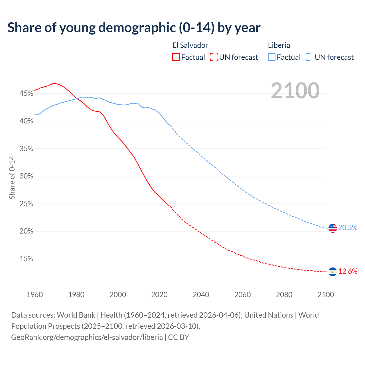 - The share of young demographic (0-15 years old) in El Salvador is 24.8% vs 39.5% in Liberia.