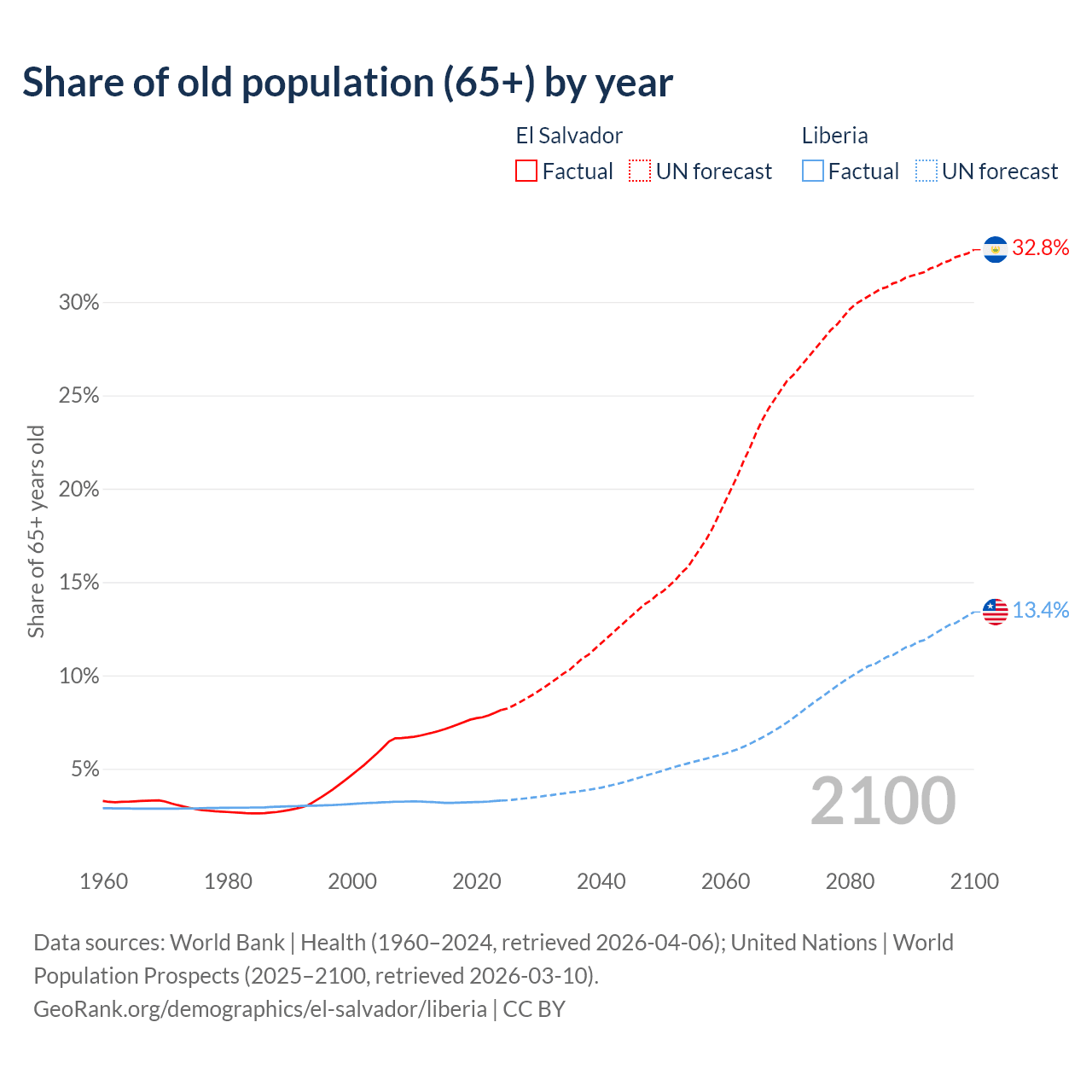 The share of older people aged 65 and over is 8.15% in El Salvador and 3.3% in Liberia. Life expectancy in El Salvador compared to Liberia .