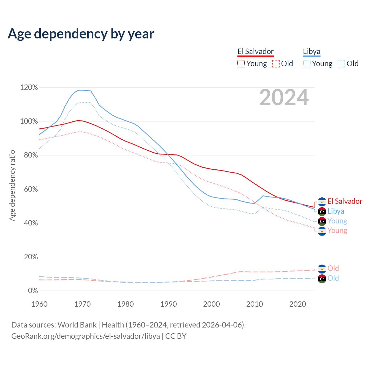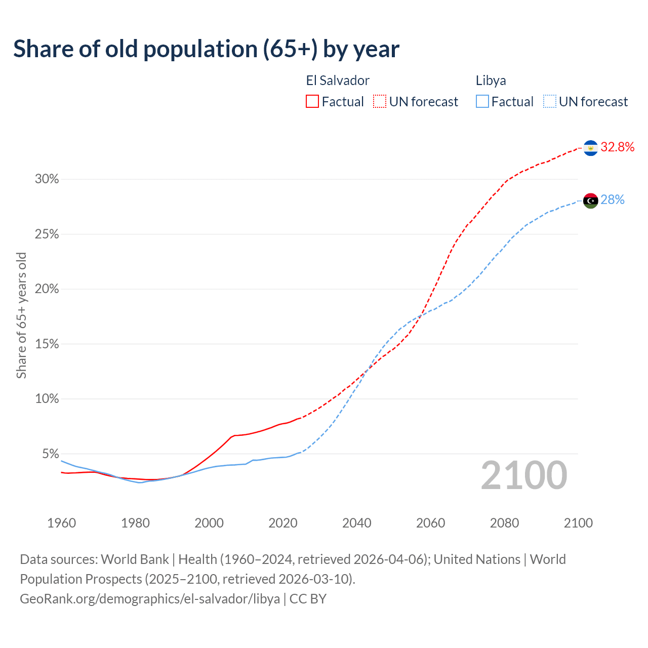 - The share of old-age demographic (65+) in El Salvador is 8.15% vs 5.02% in Libya.