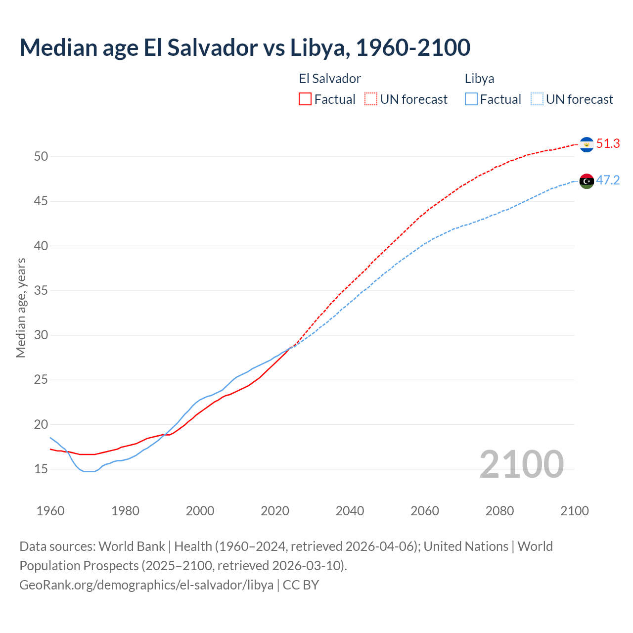 - The median age in El Salvador is 28.5 years compared to 28.5 years in Libya.