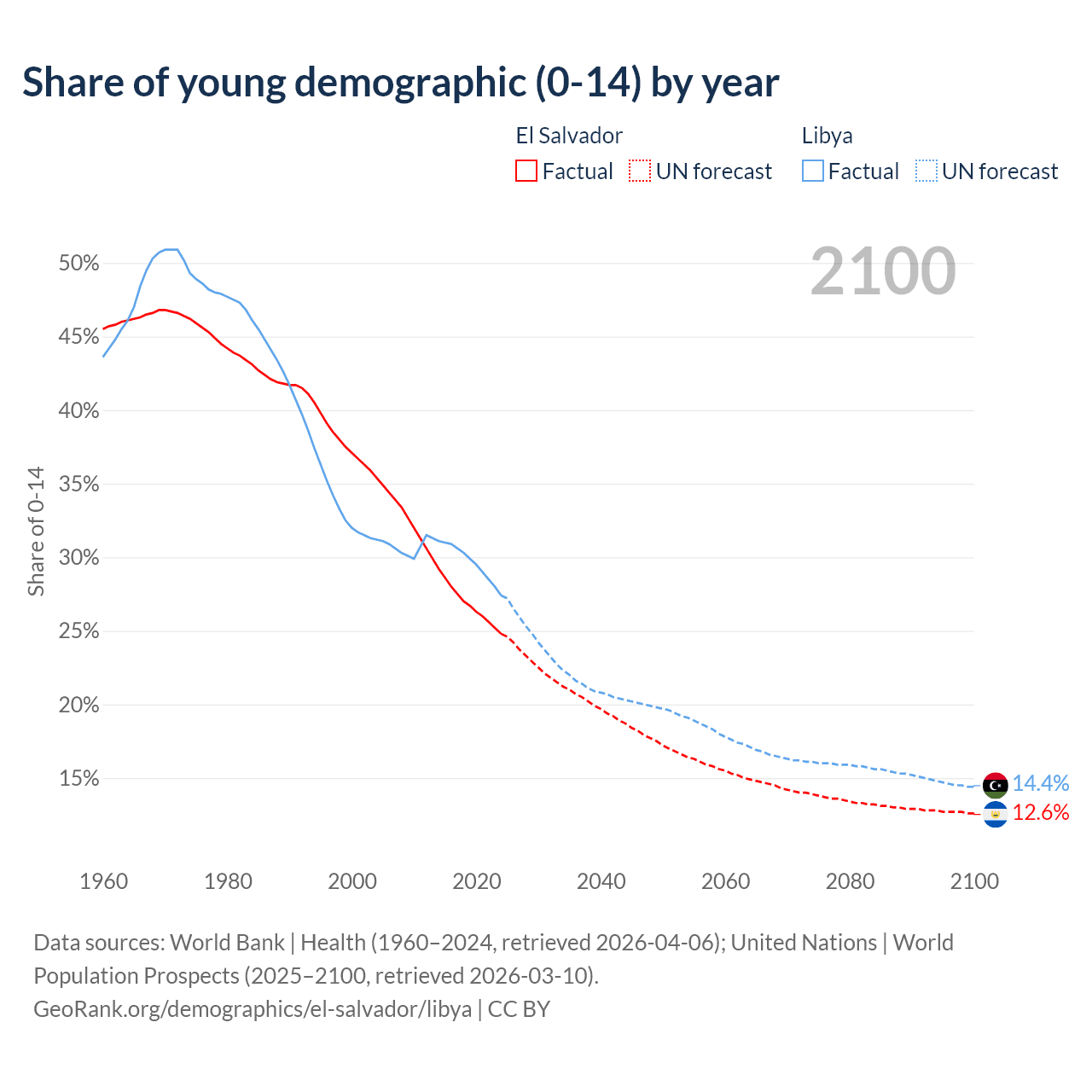 - The share of young demographic (0-15 years old) in El Salvador is 24.8% vs 27.4% in Libya.