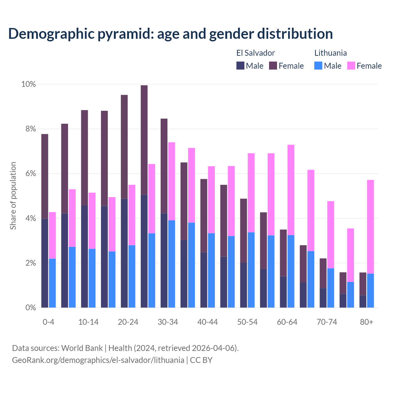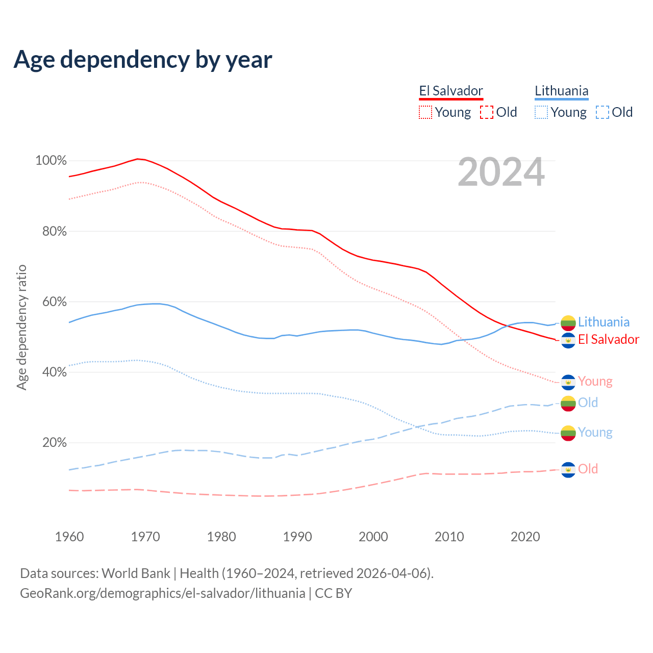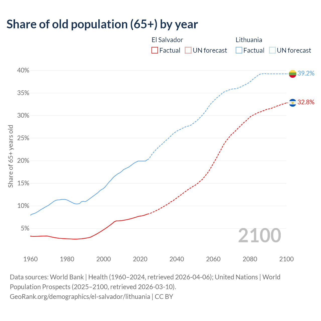 - The share of old-age demographic (65+) in El Salvador is 8.15% vs 20.2% in Lithuania.