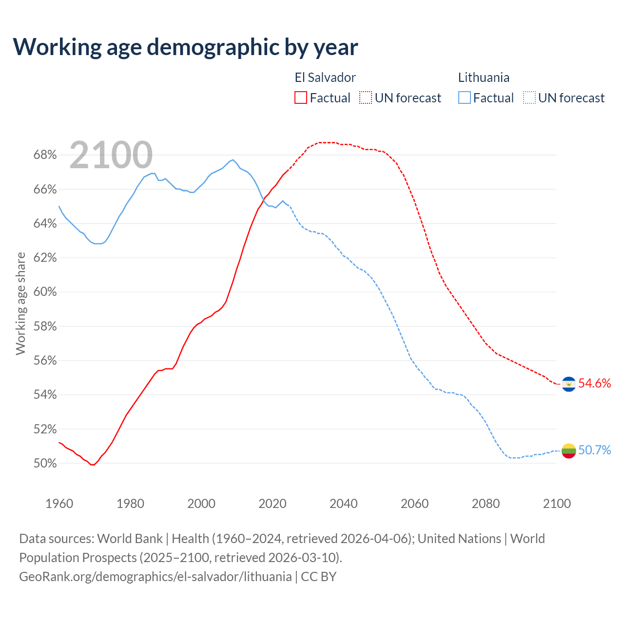 - El Salvador has 4.29M working age adults (aged 15-64) vs 1.84M in Lithuania.