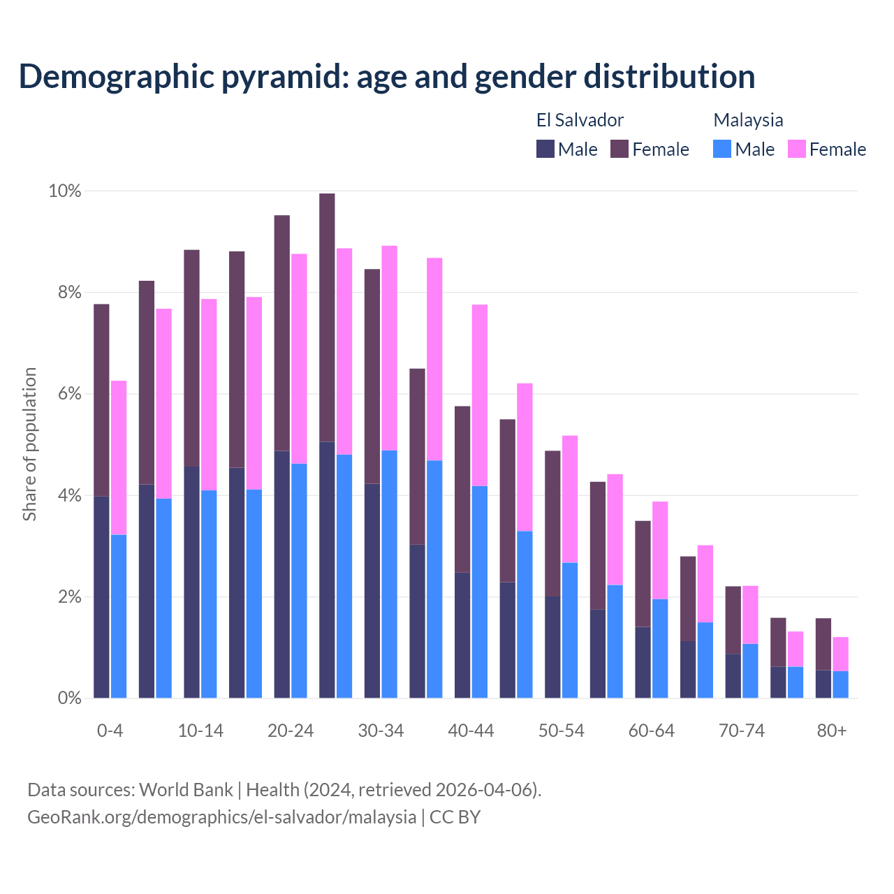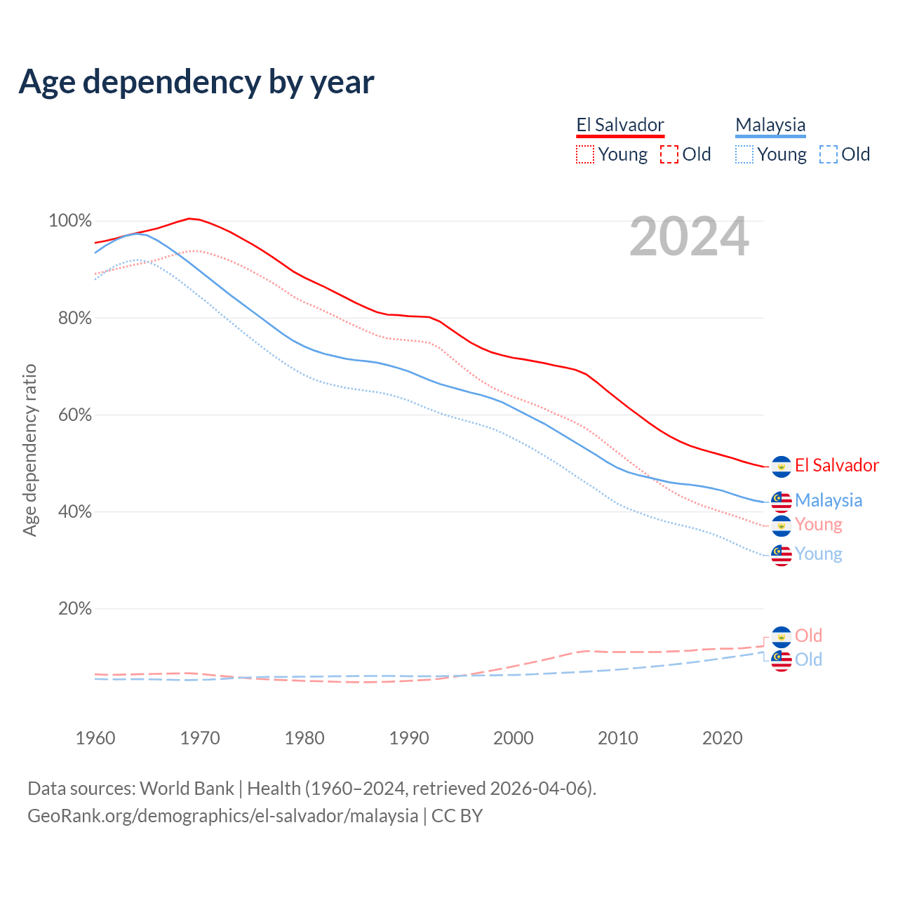 - El Salvador is ranked 115/196 by median age (oldest to youngest) vs 92/196 for Malaysia.