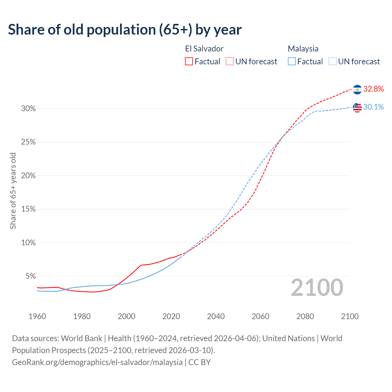 The share of older people aged 65 and over is 8.15% in El Salvador and 7.74% in Malaysia. Life expectancy in El Salvador compared to Malaysia .