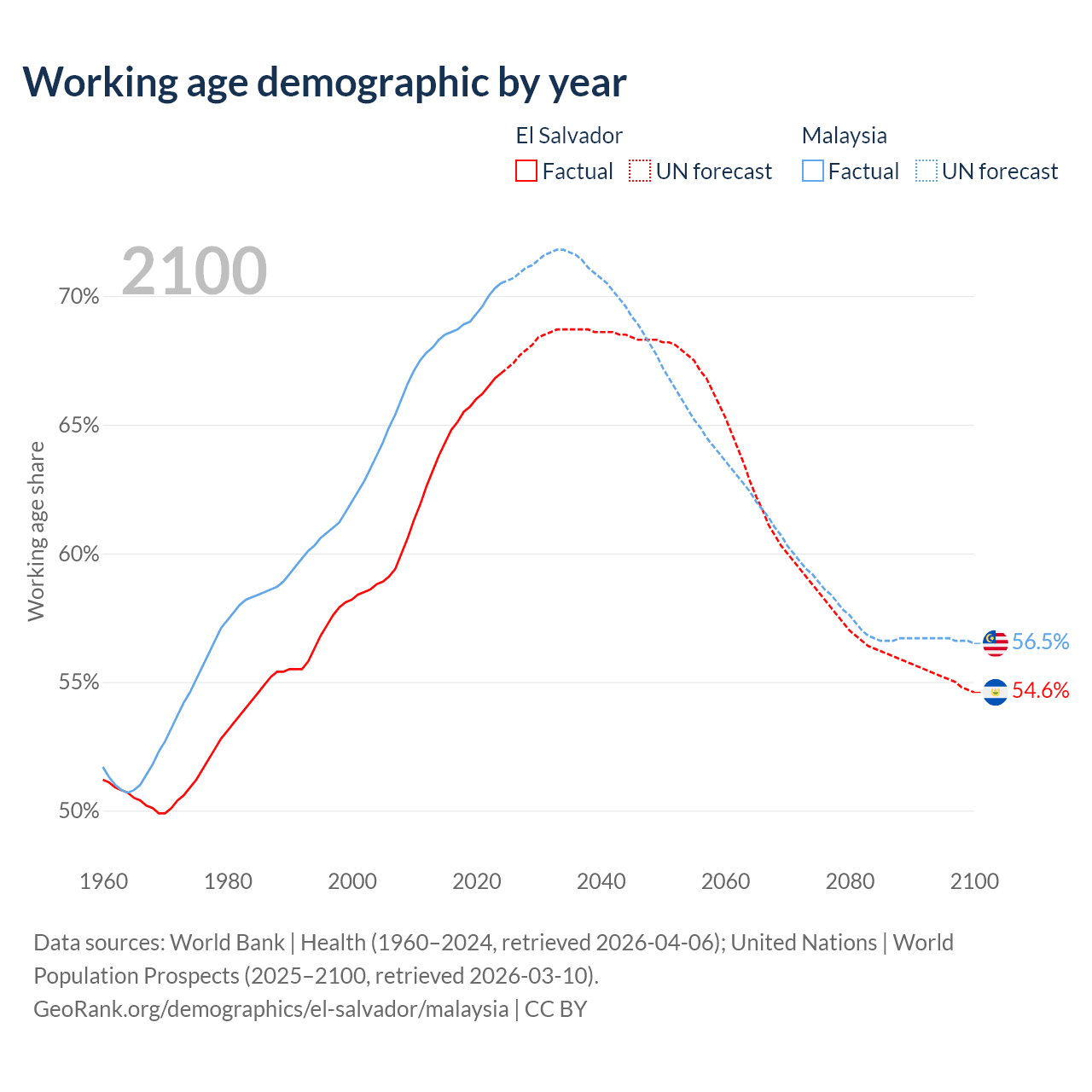 - El Salvador has 4.29M working age adults (aged 15-64) vs 25.7M in Malaysia.