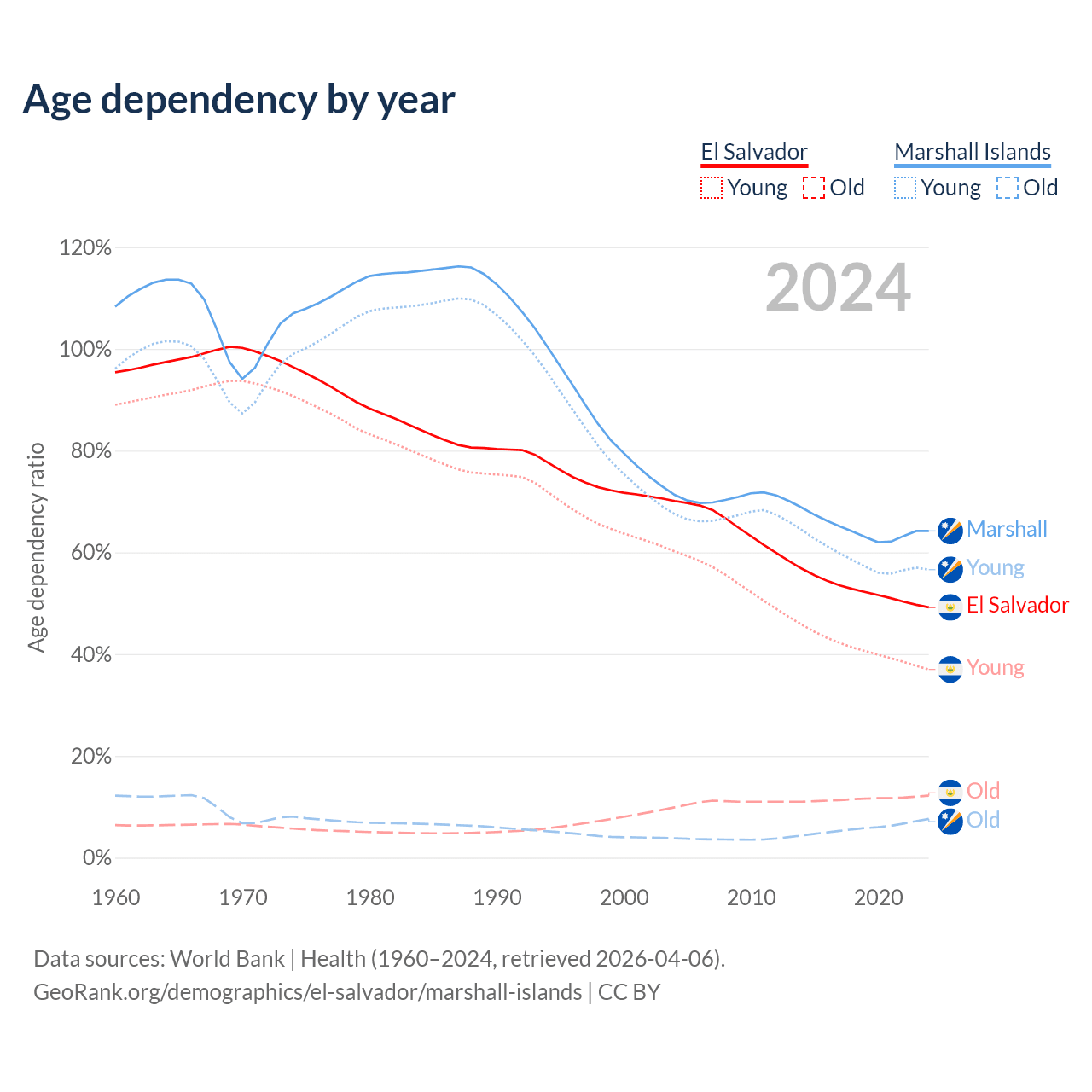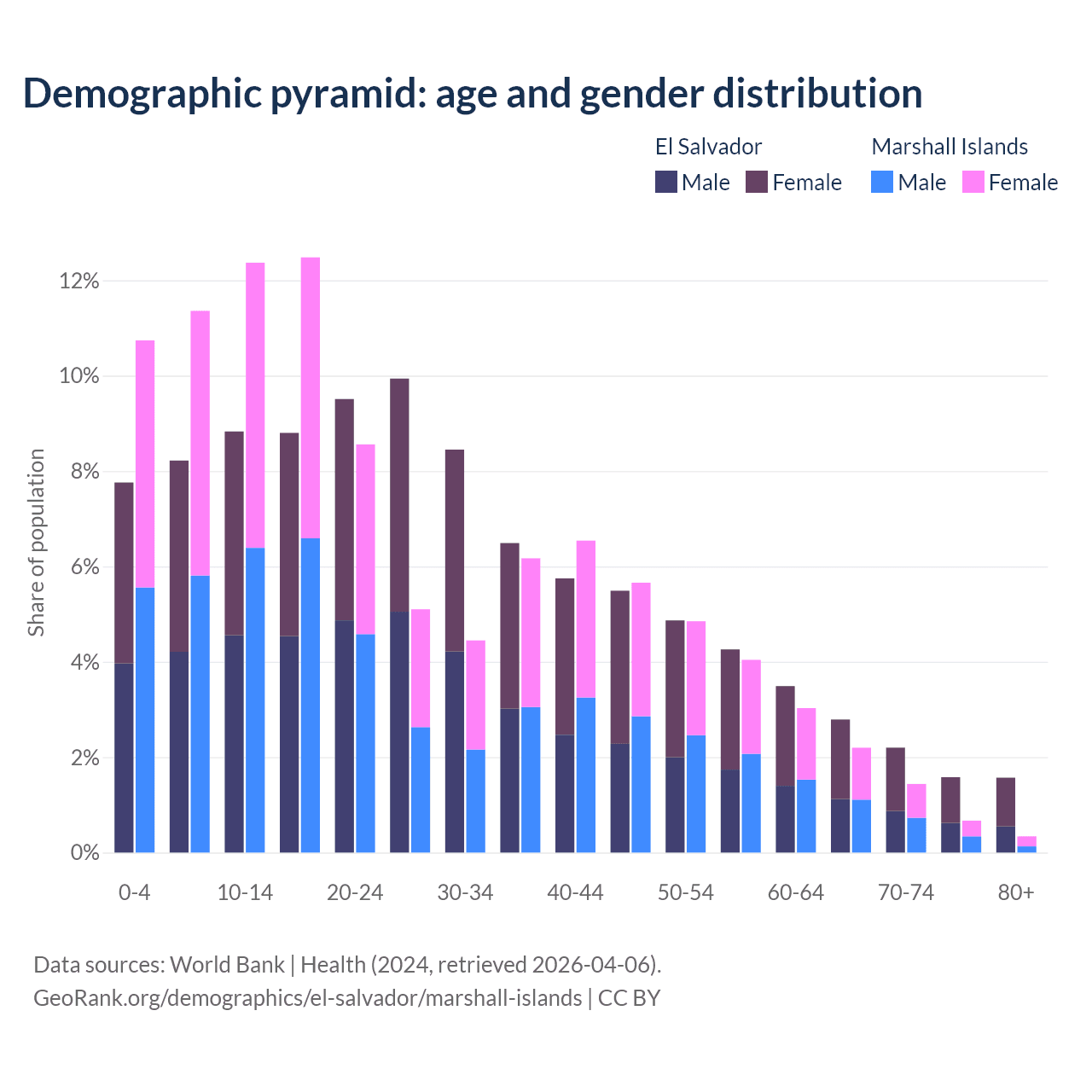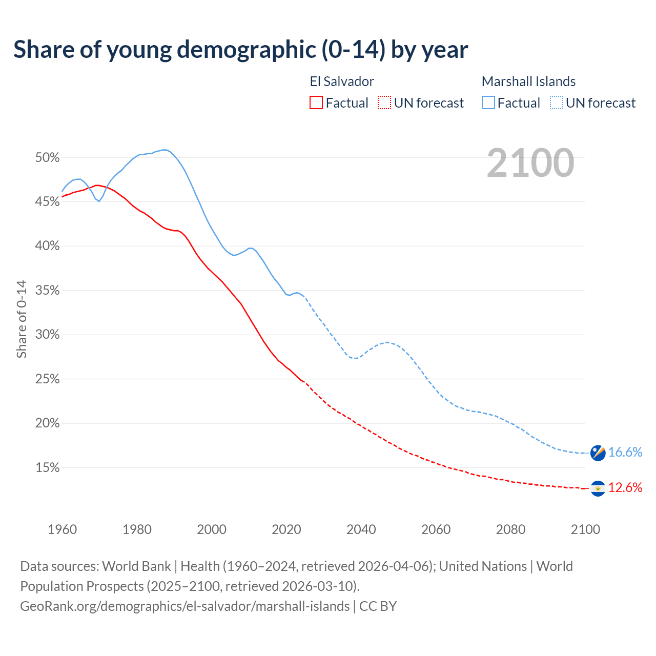 - The share of young demographic (0-15 years old) in El Salvador is 24.8% vs 34.5% in the Marshall Islands.