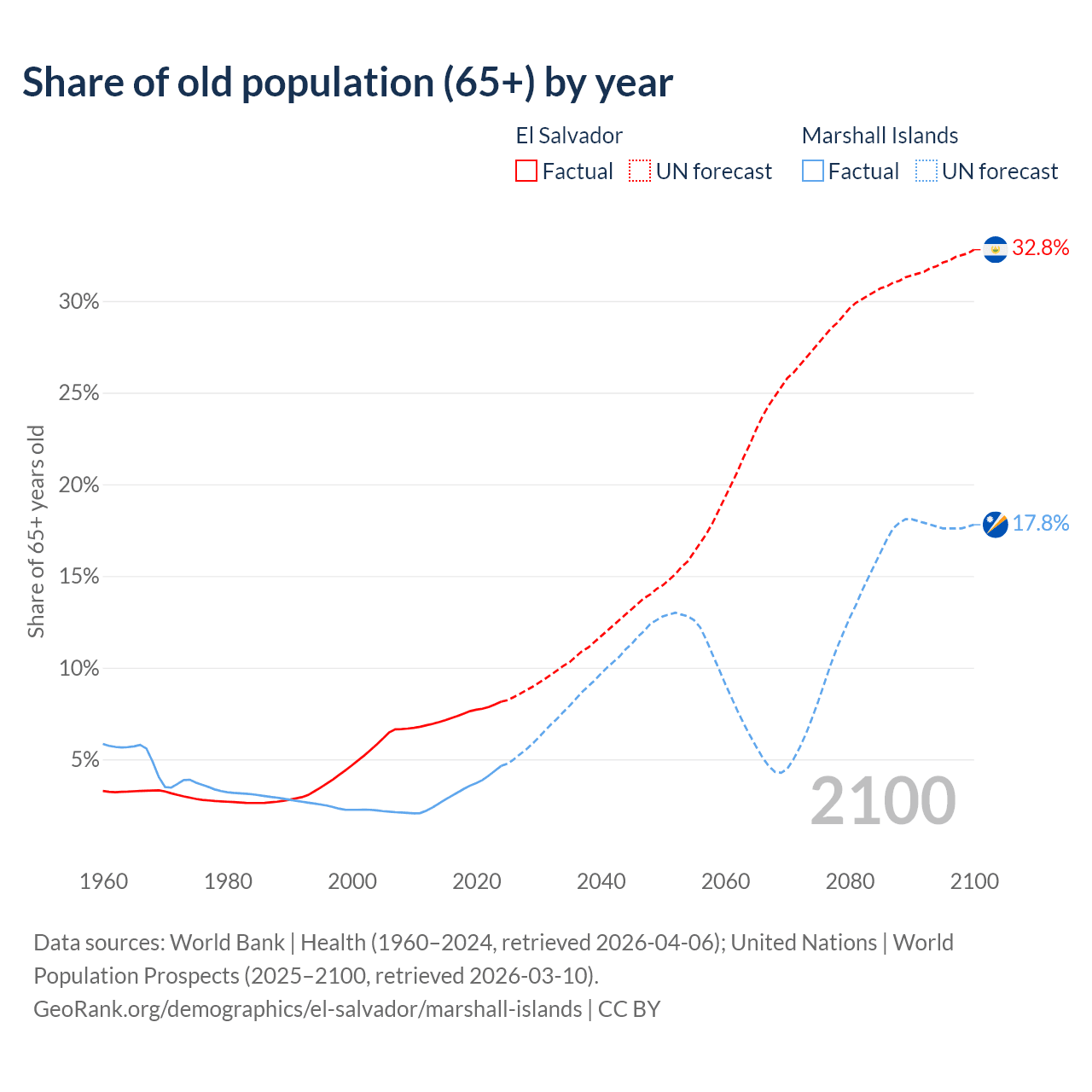 - The share of old-age demographic (65+) in El Salvador is 8.15% vs 4.64% in the Marshall Islands.