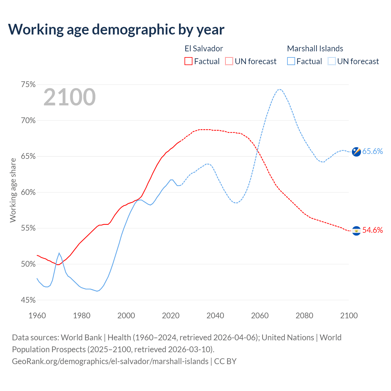 Median age El Salvador vs Marshall Islands, 1960-2100