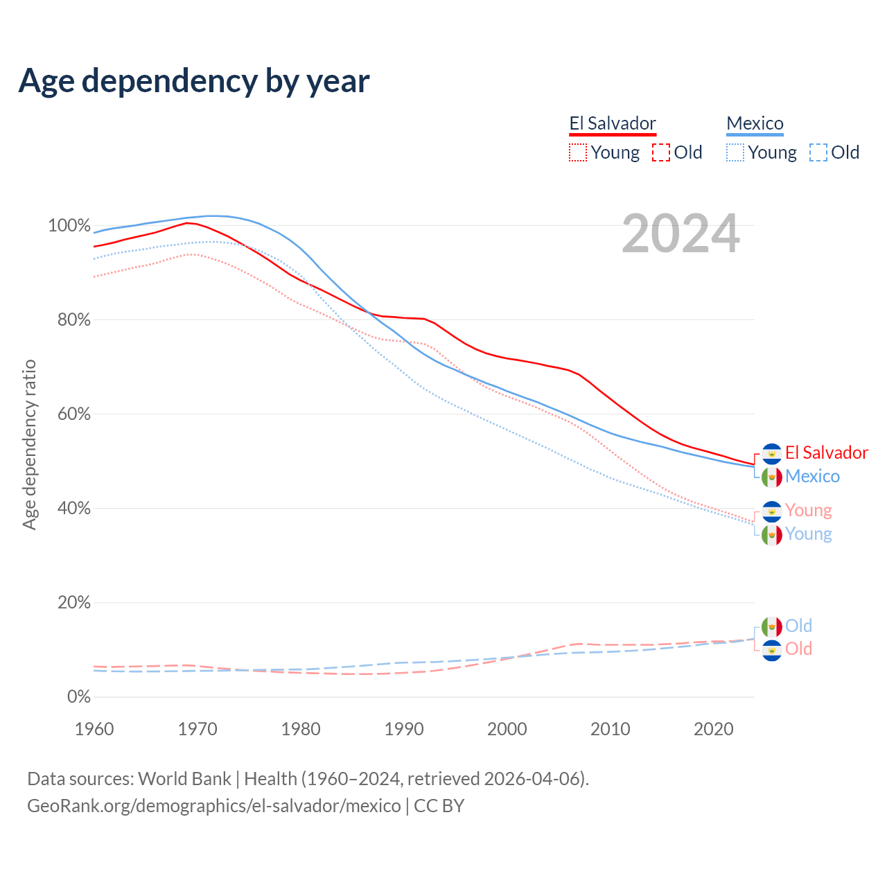 - El Salvador is ranked 115/196 by median age (oldest to youngest) vs 102/196 for Mexico.