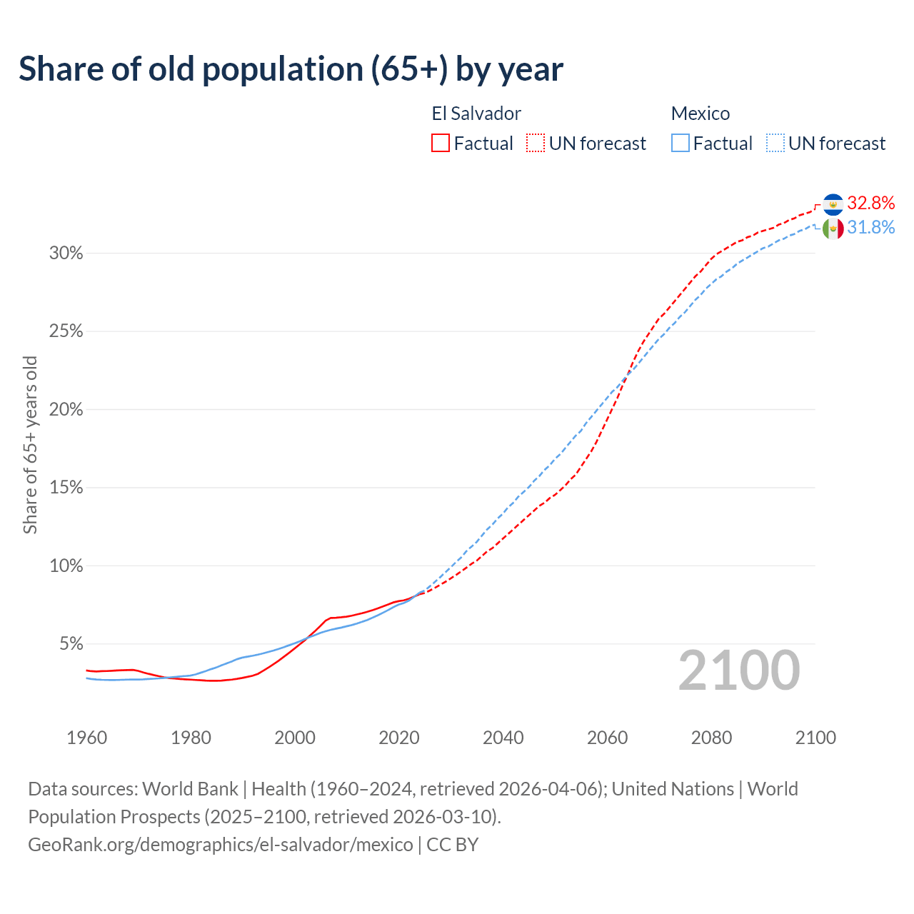 The share of older people aged 65 and over is 8.15% in El Salvador and 8.25% in Mexico. Life expectancy in El Salvador compared to Mexico .