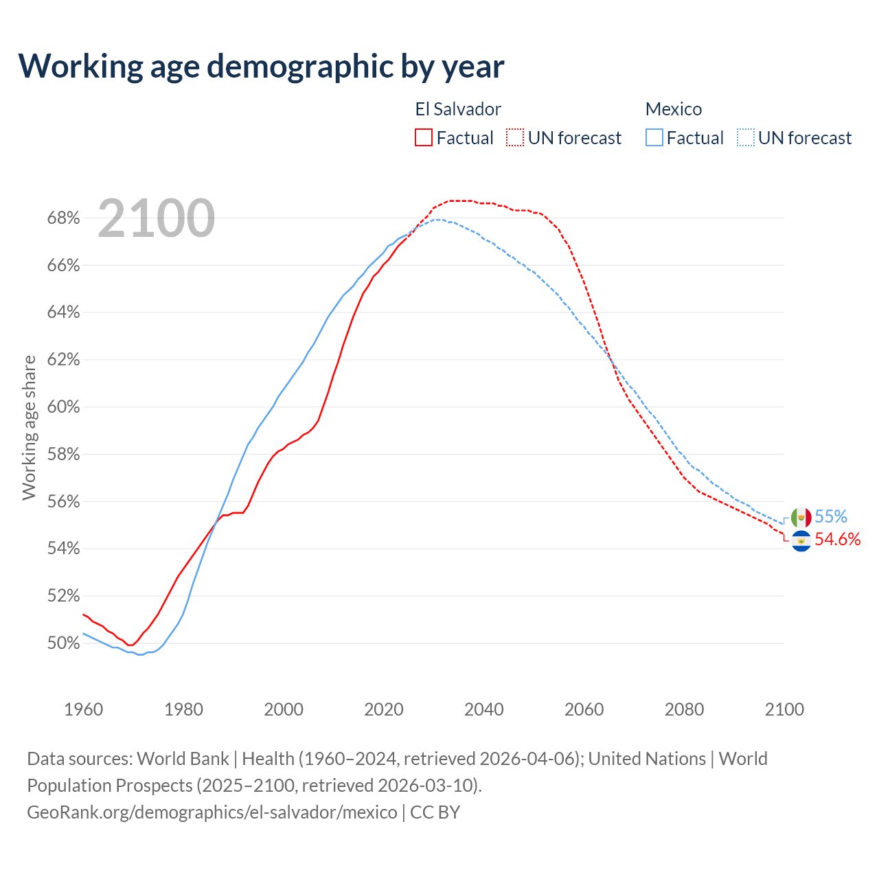 - El Salvador has 4.29M working age adults (aged 15-64) vs 89.6M in Mexico.