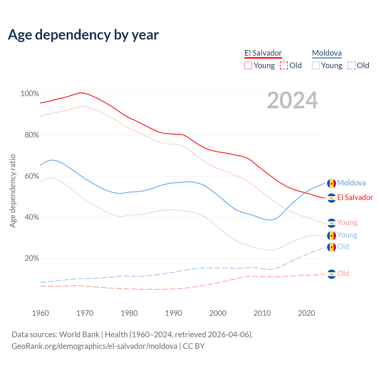 - El Salvador is ranked 115/196 by median age (oldest to youngest) vs 54/196 for Moldova.