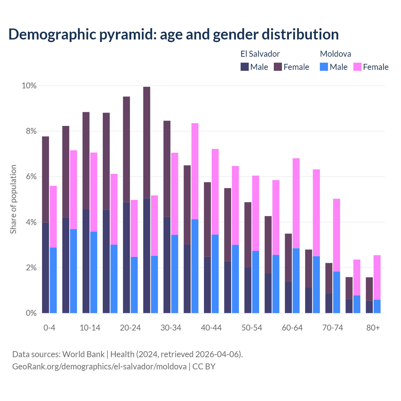 - As of 2026, the population of El Salvador is 6.4M vs 2.34M in Moldova - 2.73 times difference.