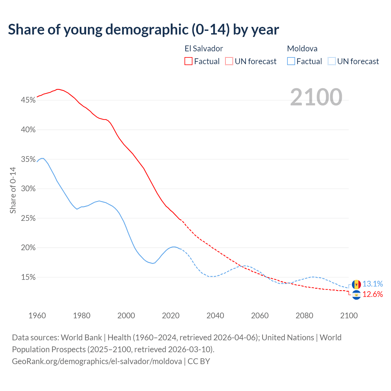 - The share of young demographic (0-15 years old) in El Salvador is 24.8% vs 19.8% in Moldova.