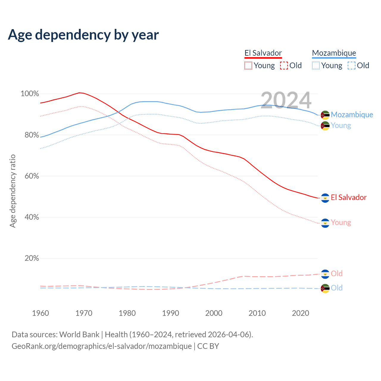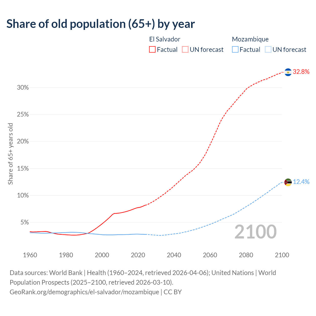 - The share of old-age demographic (65+) in El Salvador is 8.15% vs 2.75% in Mozambique.