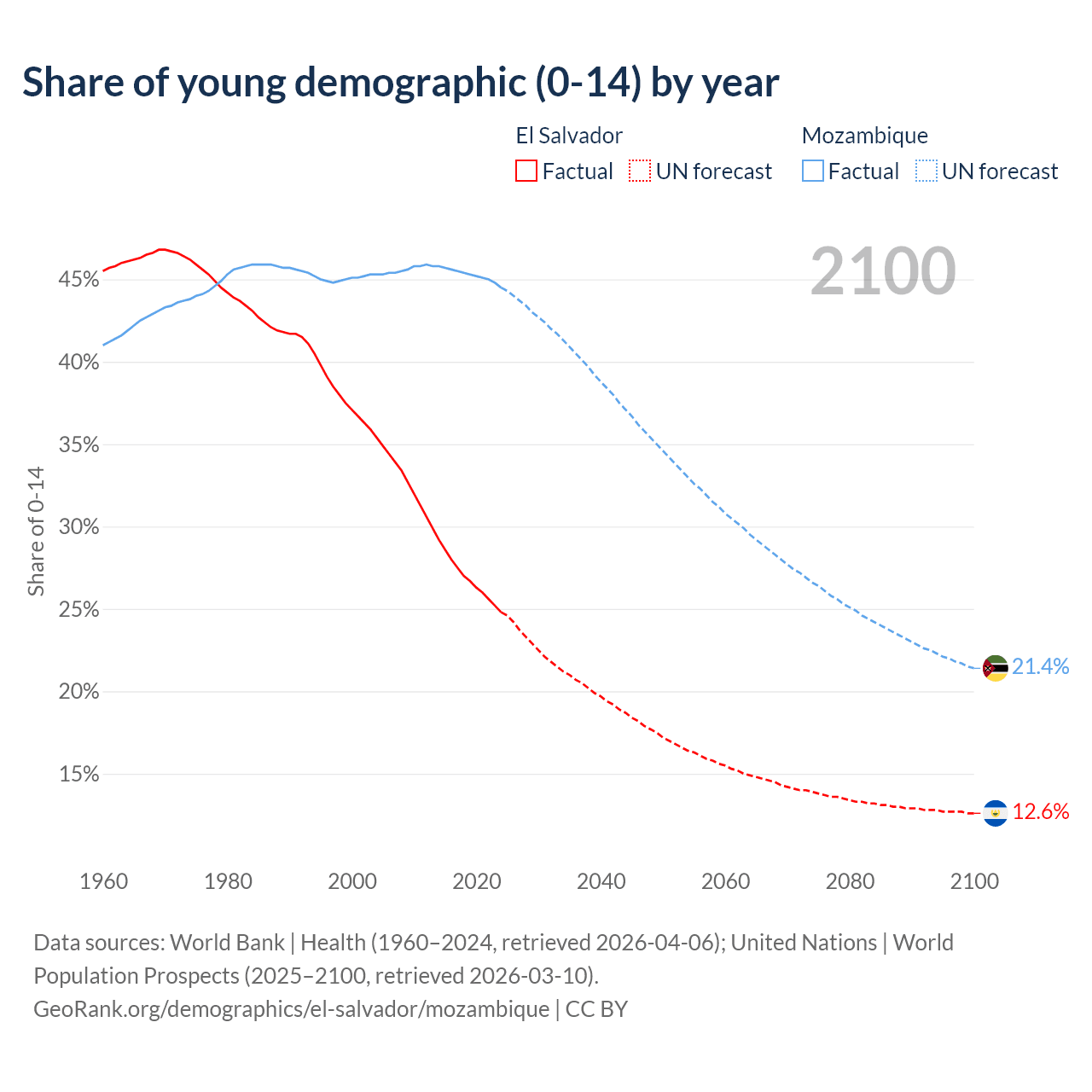 - The share of young demographic (0-15 years old) in El Salvador is 24.8% vs 44.5% in Mozambique.