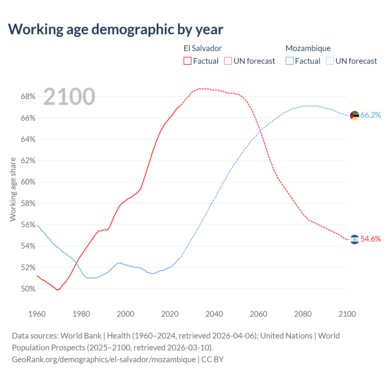 Median age El Salvador vs Mozambique, 1960-2100