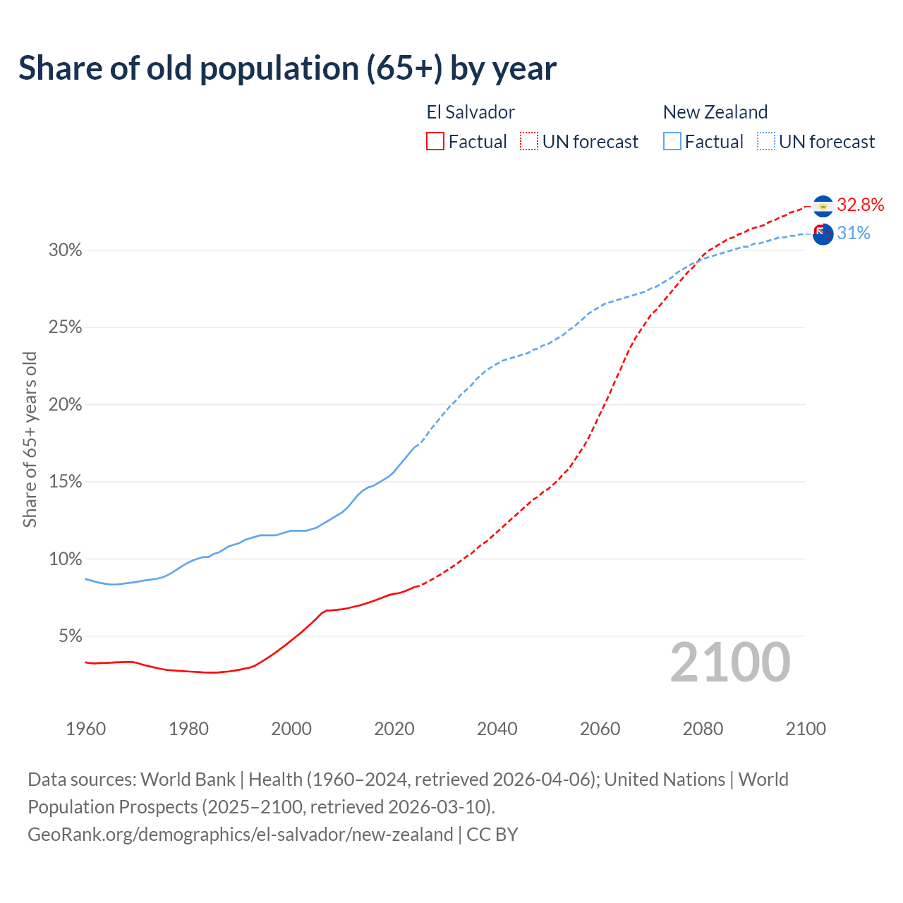 - The share of old-age demographic (65+) in El Salvador is 8.15% vs 17.2% in New Zealand.