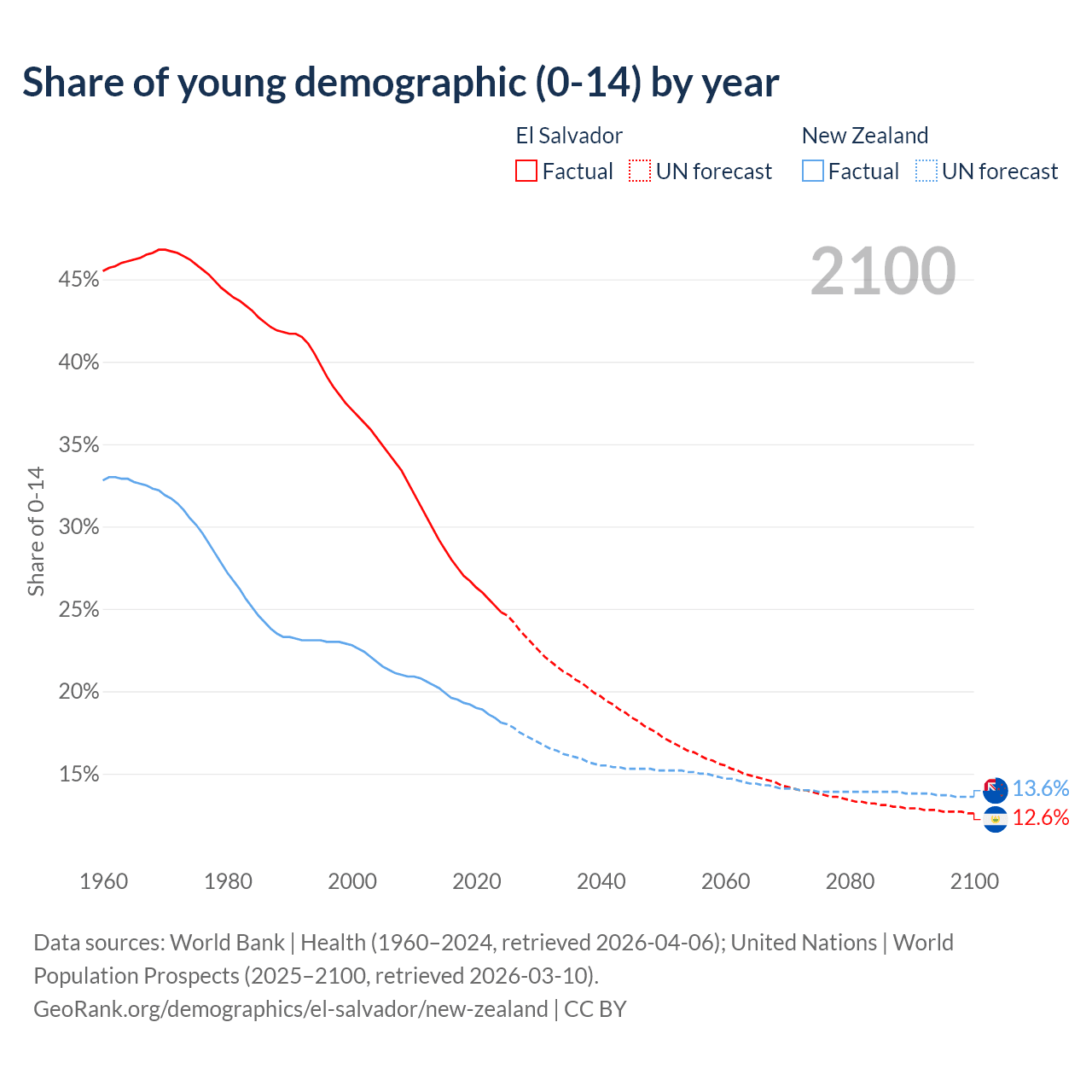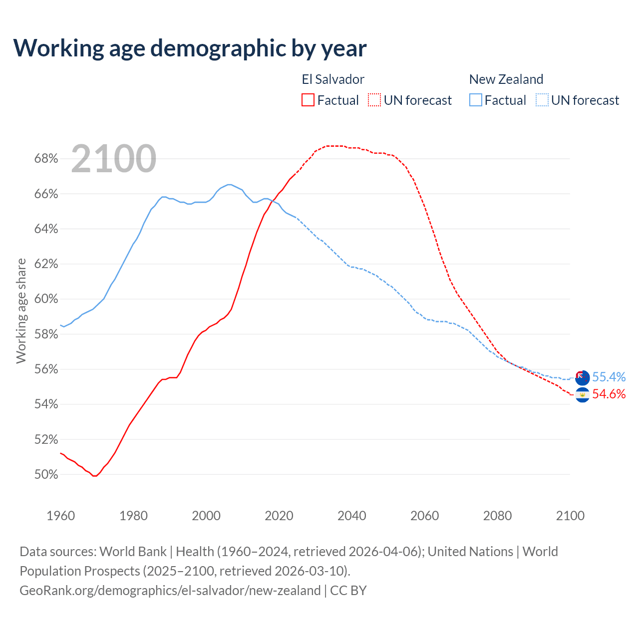 Median age El Salvador vs New Zealand, 1960-2100