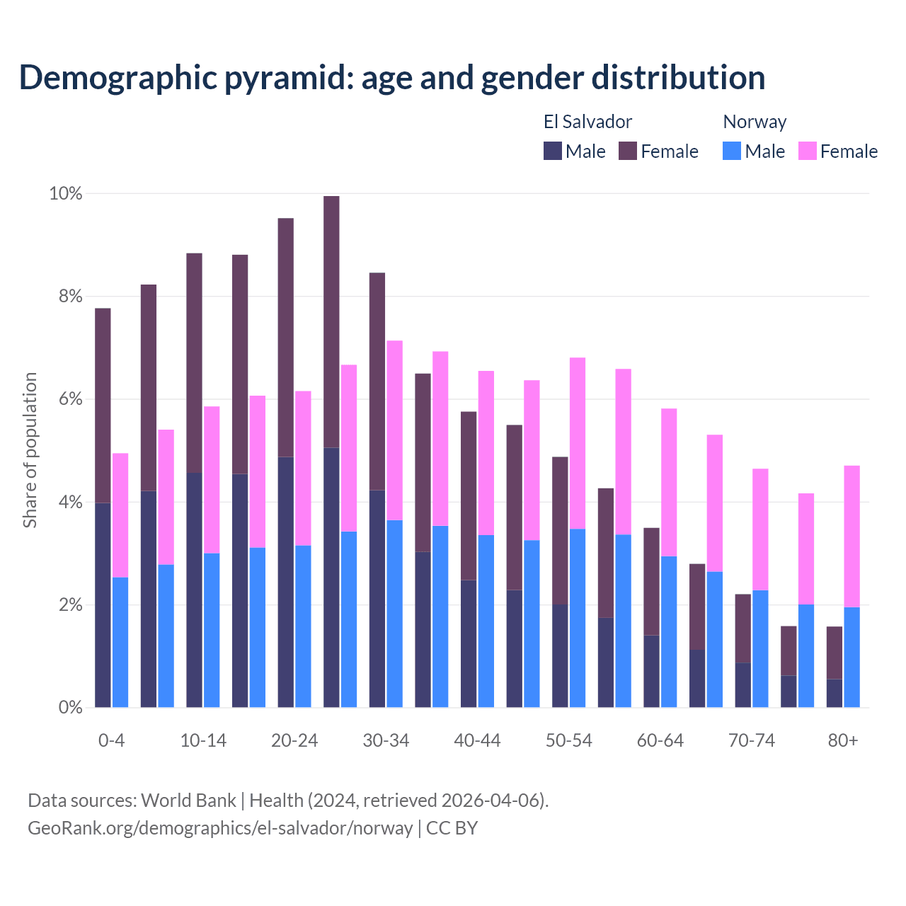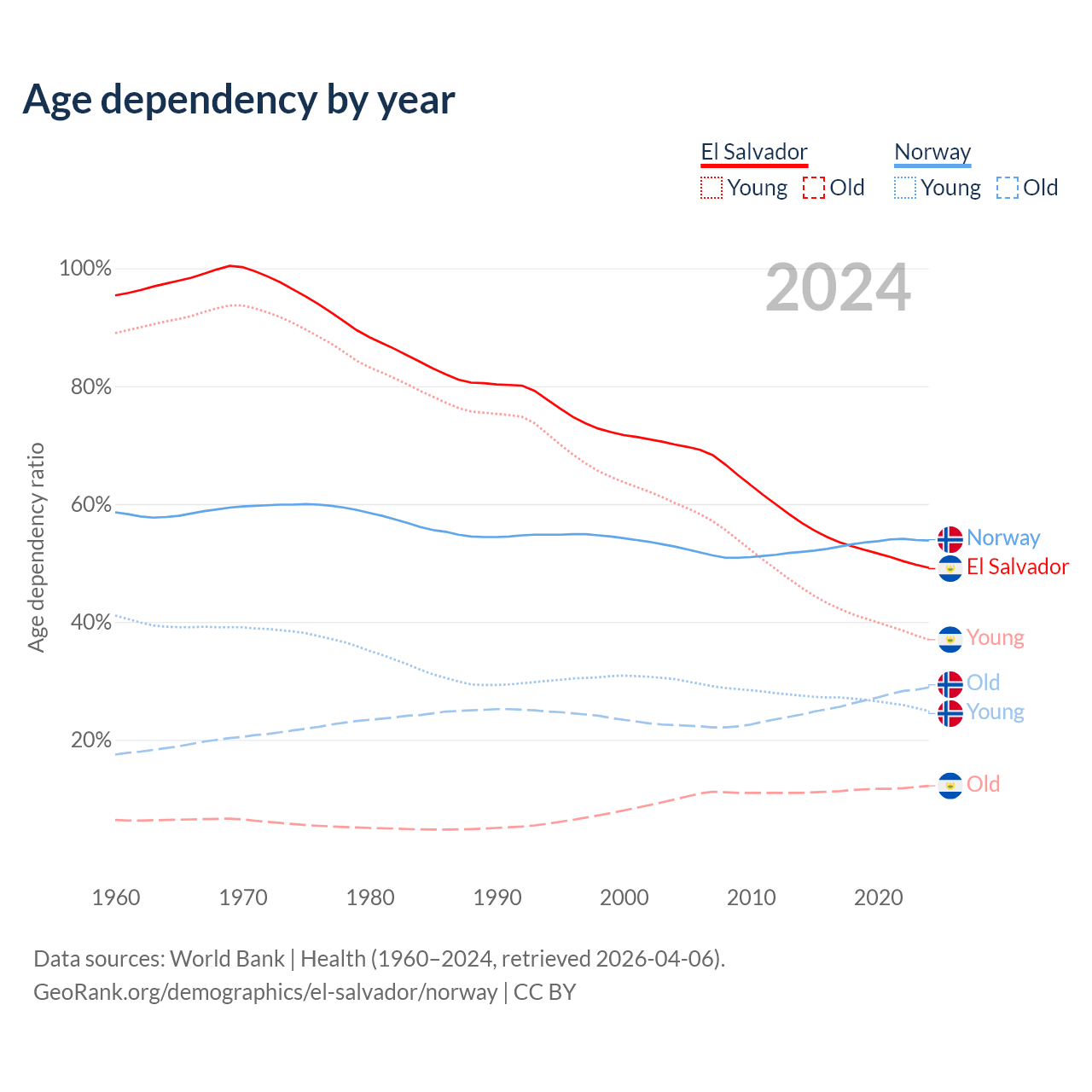 - The share of young demographic (0-15 years old) in El Salvador is 24.8% vs 16.2% in Norway.
