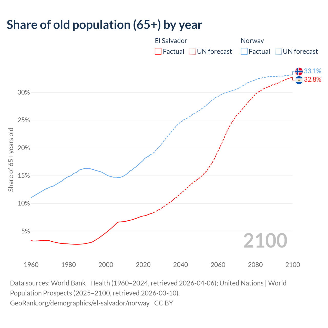- The share of old-age demographic (65+) in El Salvador is 8.15% vs 18.8% in Norway.