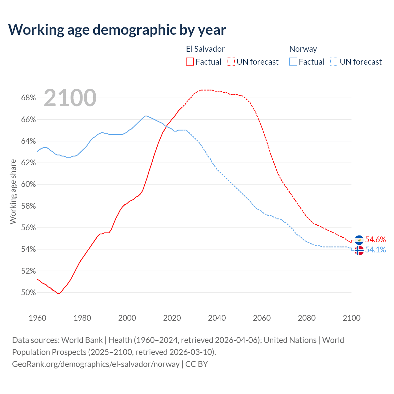 - El Salvador has 4.29M working age adults (aged 15-64) vs 3.69M in Norway.
