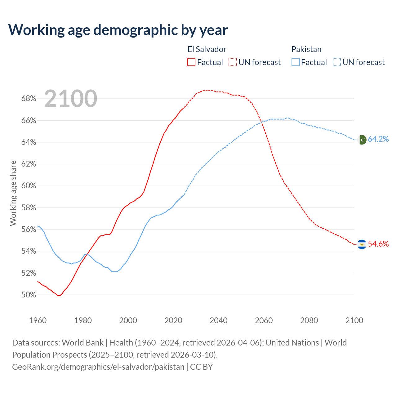 Median age El Salvador vs Pakistan, 1960-2100