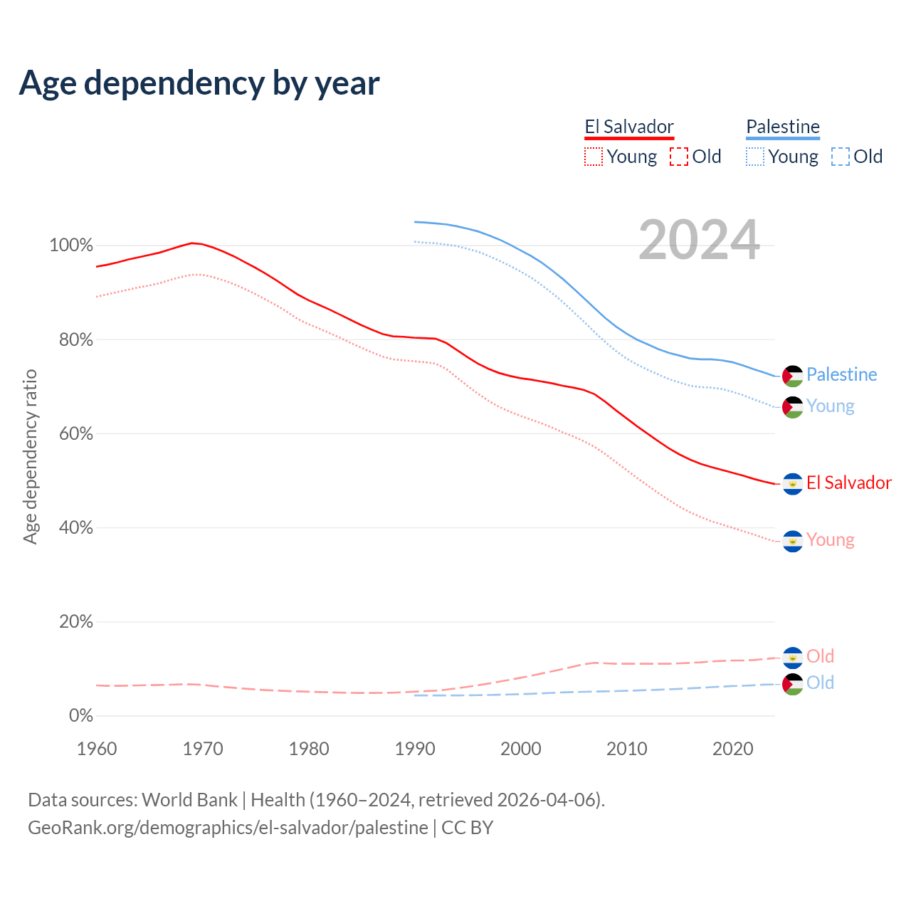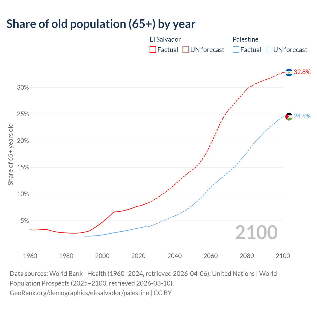 - The share of old-age demographic (65+) in El Salvador is 8.15% vs 3.84% in Palestine.