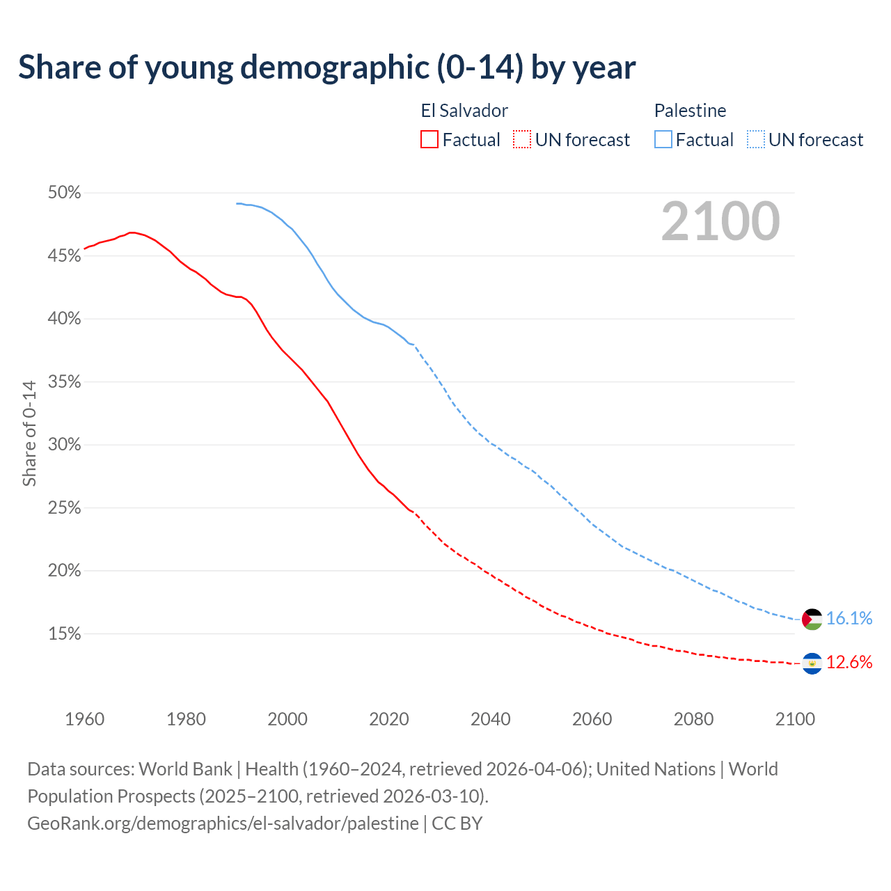 - The share of young demographic (0-15 years old) in El Salvador is 24.8% vs 38% in Palestine.