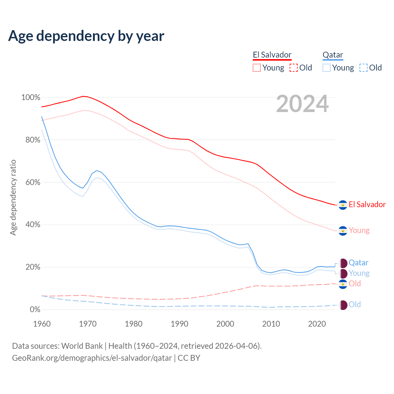 - The share of old-age demographic (65+) in El Salvador is 8.15% vs 1.68% in Qatar.